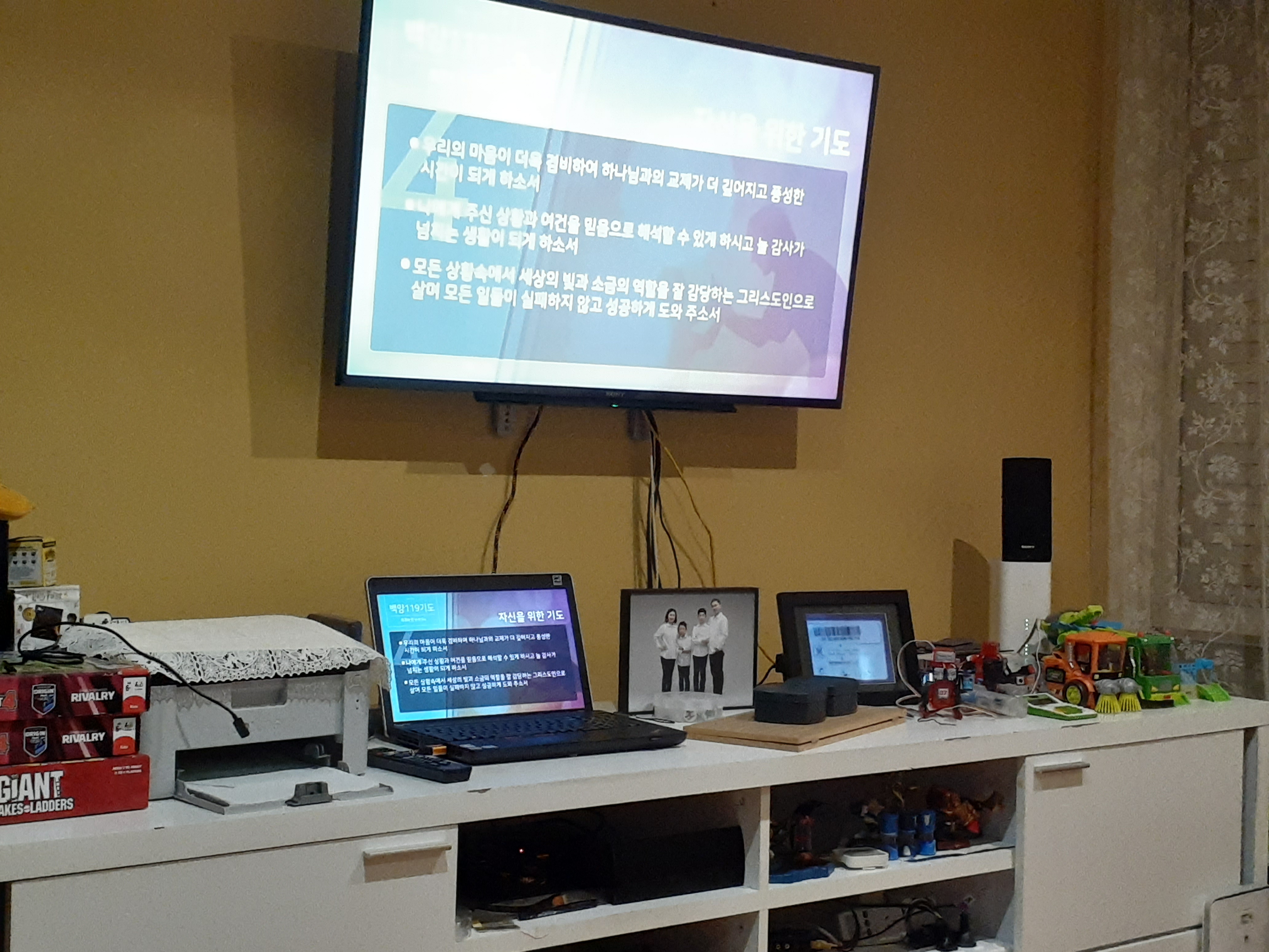 온가족 소파에 쪼르륵 앉아서 기도회로 하루를 마무리한다. 코로나 빨리 안녕~~