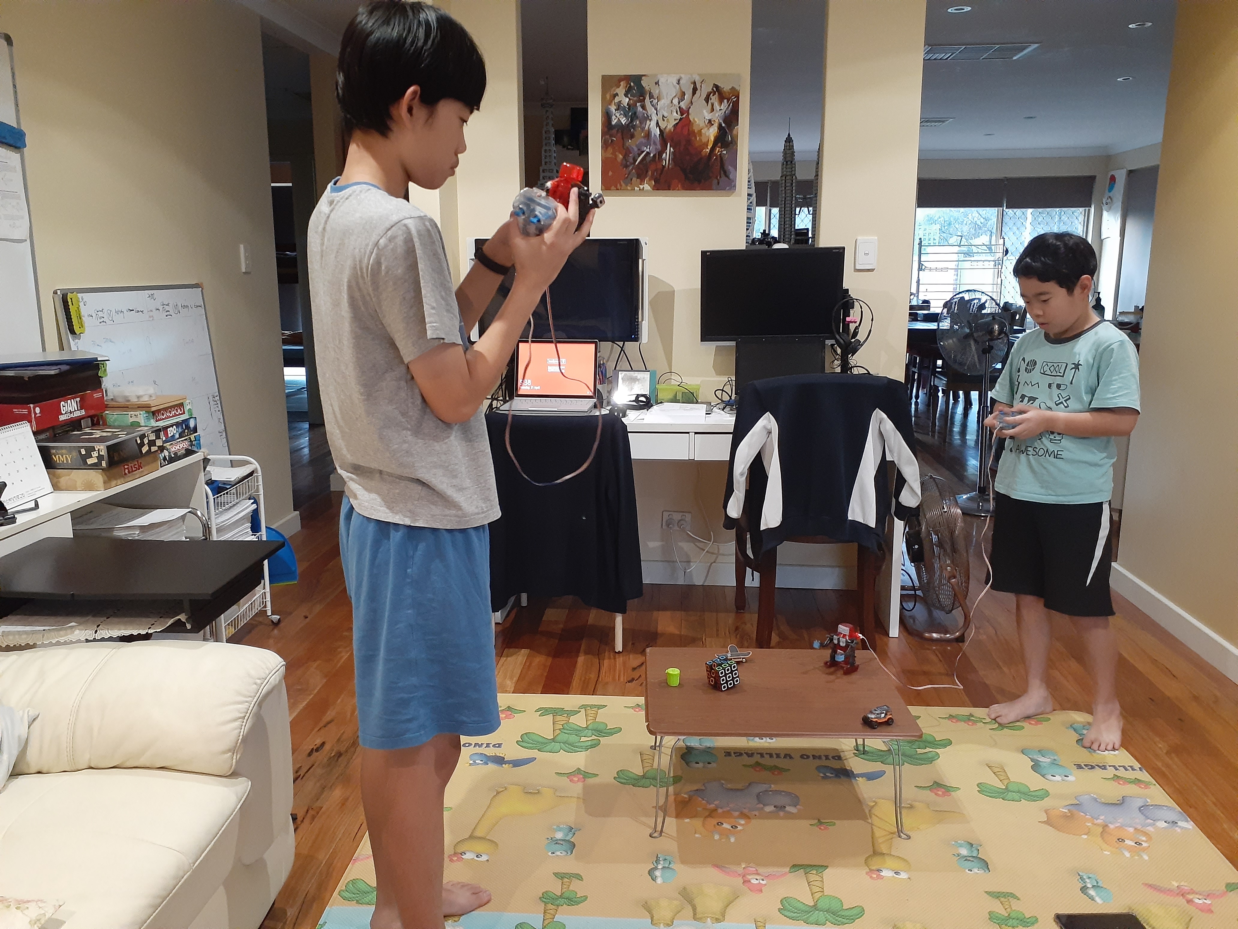 예전에 한국갔을때 과학관에서 만들어온 로봇 찾아서 대결중.