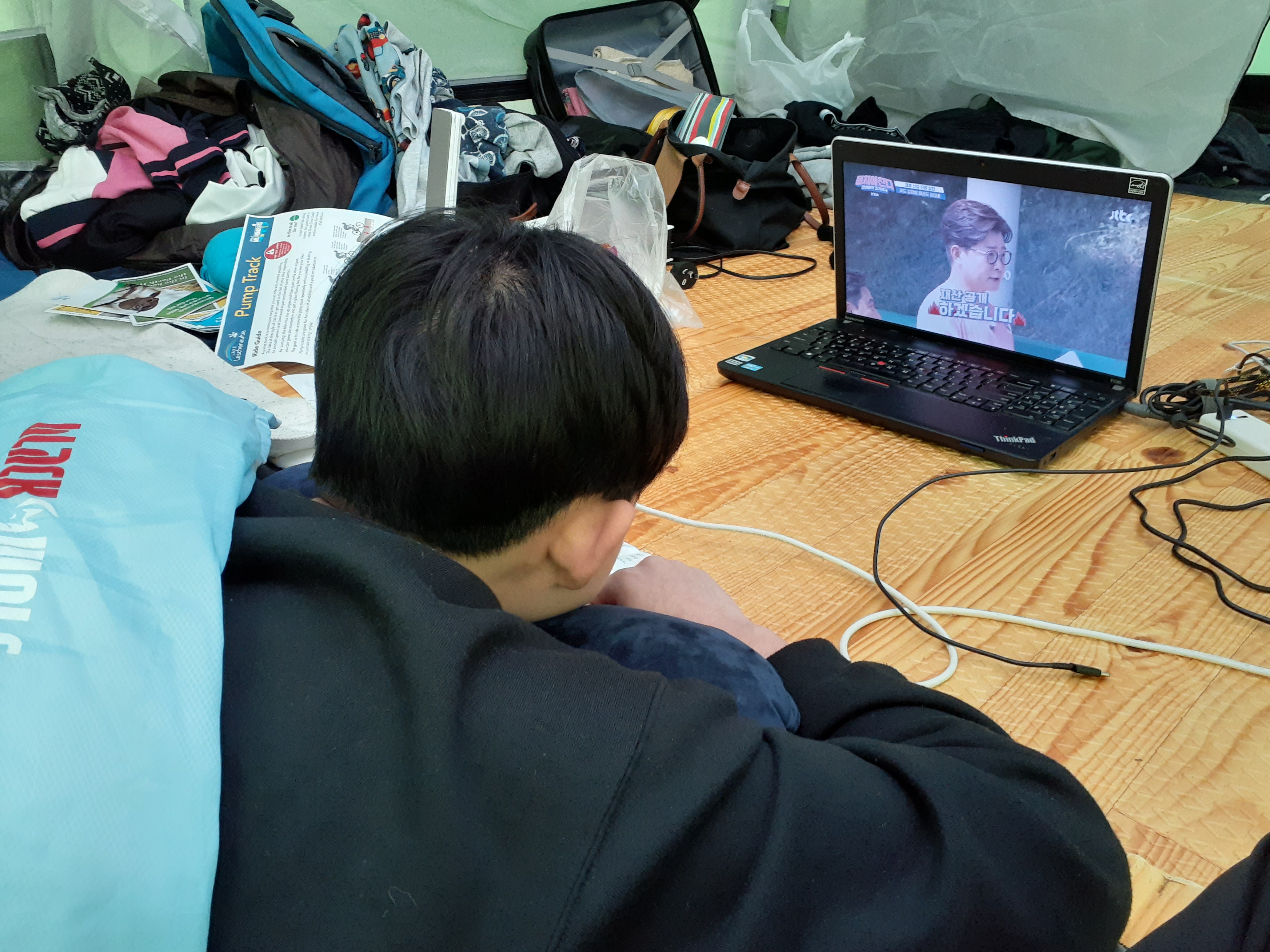 텐트치고 이틀연속 비와서 텐트안에서 장판틀고 미드보기.