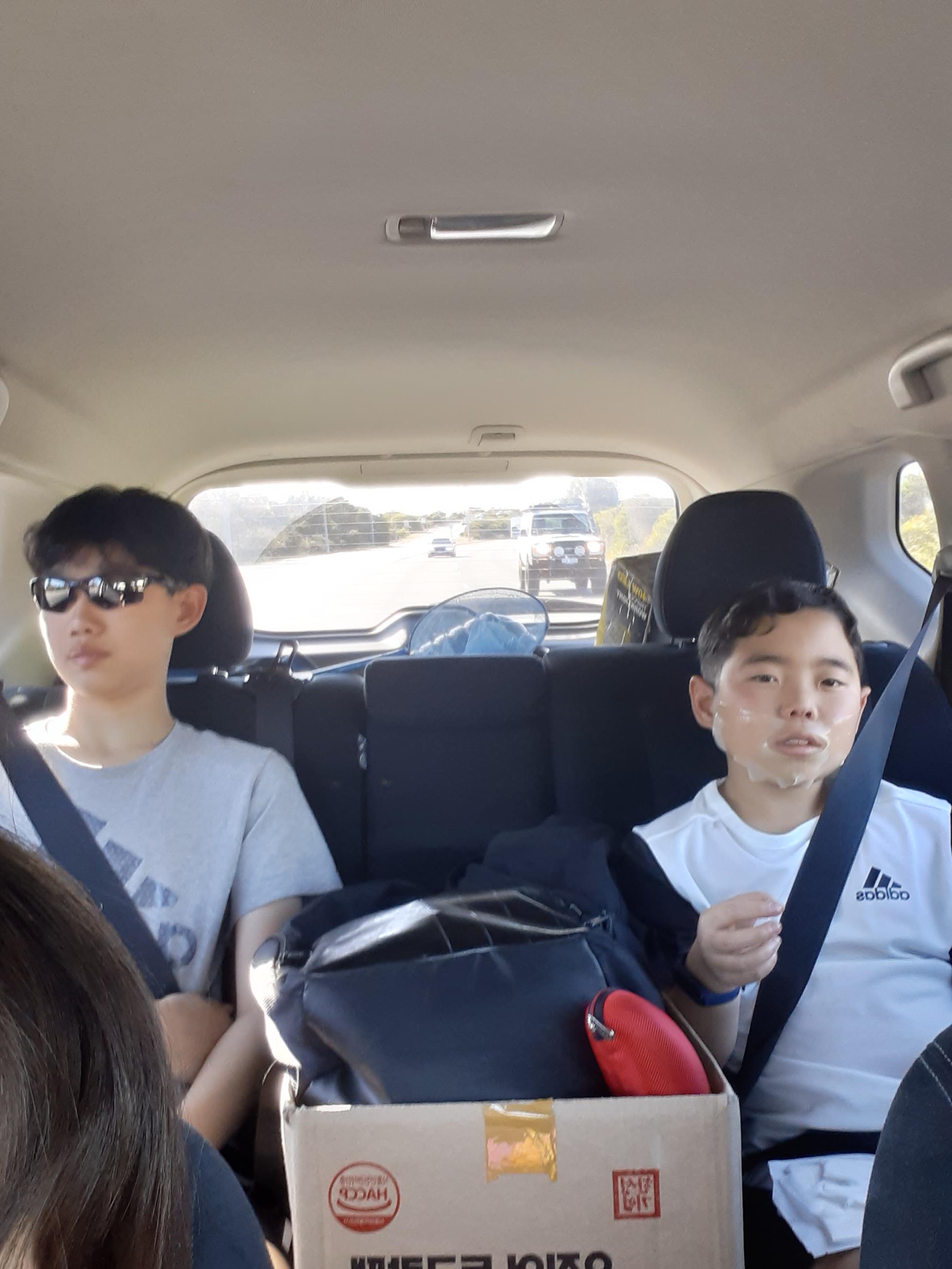 다들 얼굴이 빨갛게 타서 주헌이는 냉장고에 있는 팩 챙겨서 팩하면서 캠핑장 가는 중...