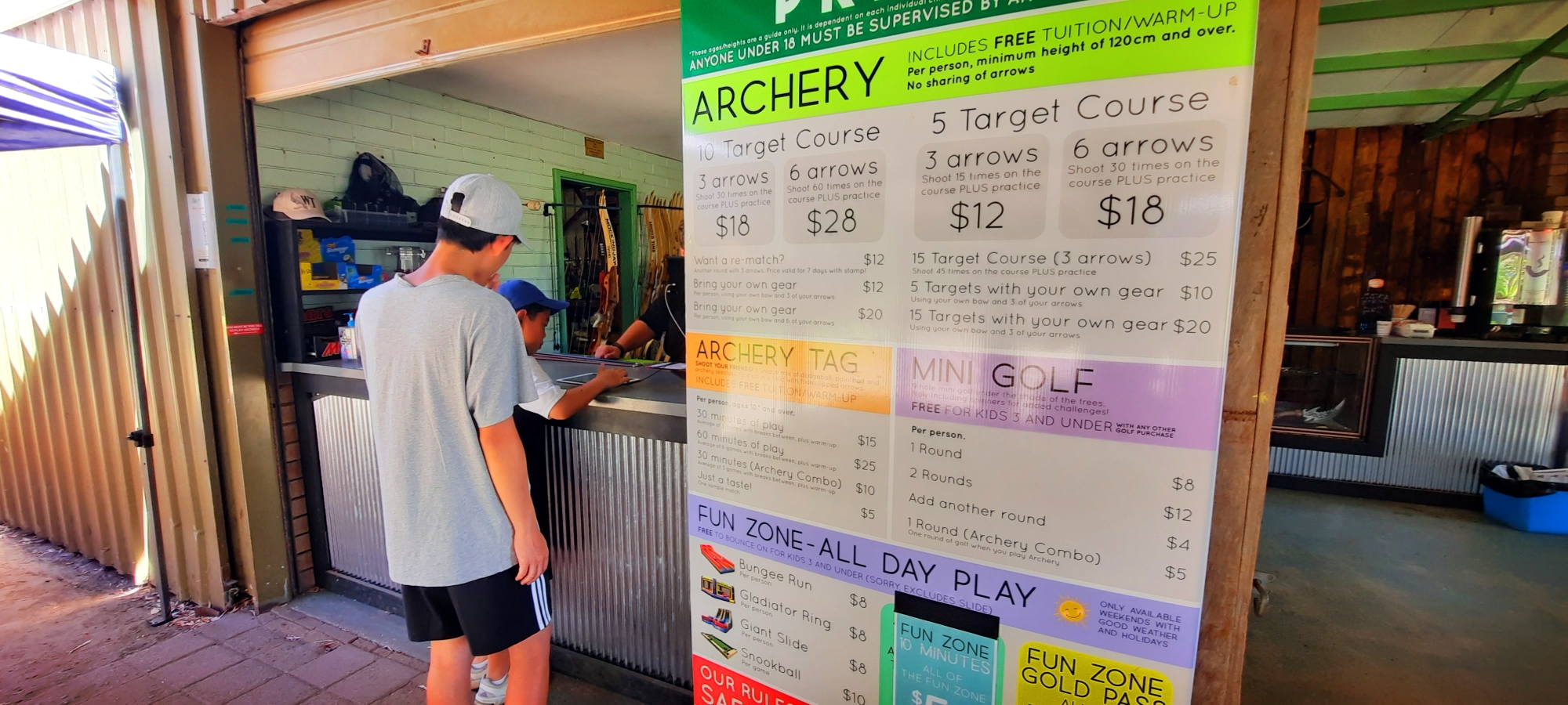 골프장 9홀 처럼 여기 양궁과녘이 10개 코스가 있다. 우리는 한 코스마다 화살 3개씩 쏘는걸로 10코스 도는거 선택 1인당 18불. 일주일 내에 다시 방문하면 12불이다. 담에 버셀톤 오면 첫날 왔다가 마지막날쯤 한번 더 와야겠다.
