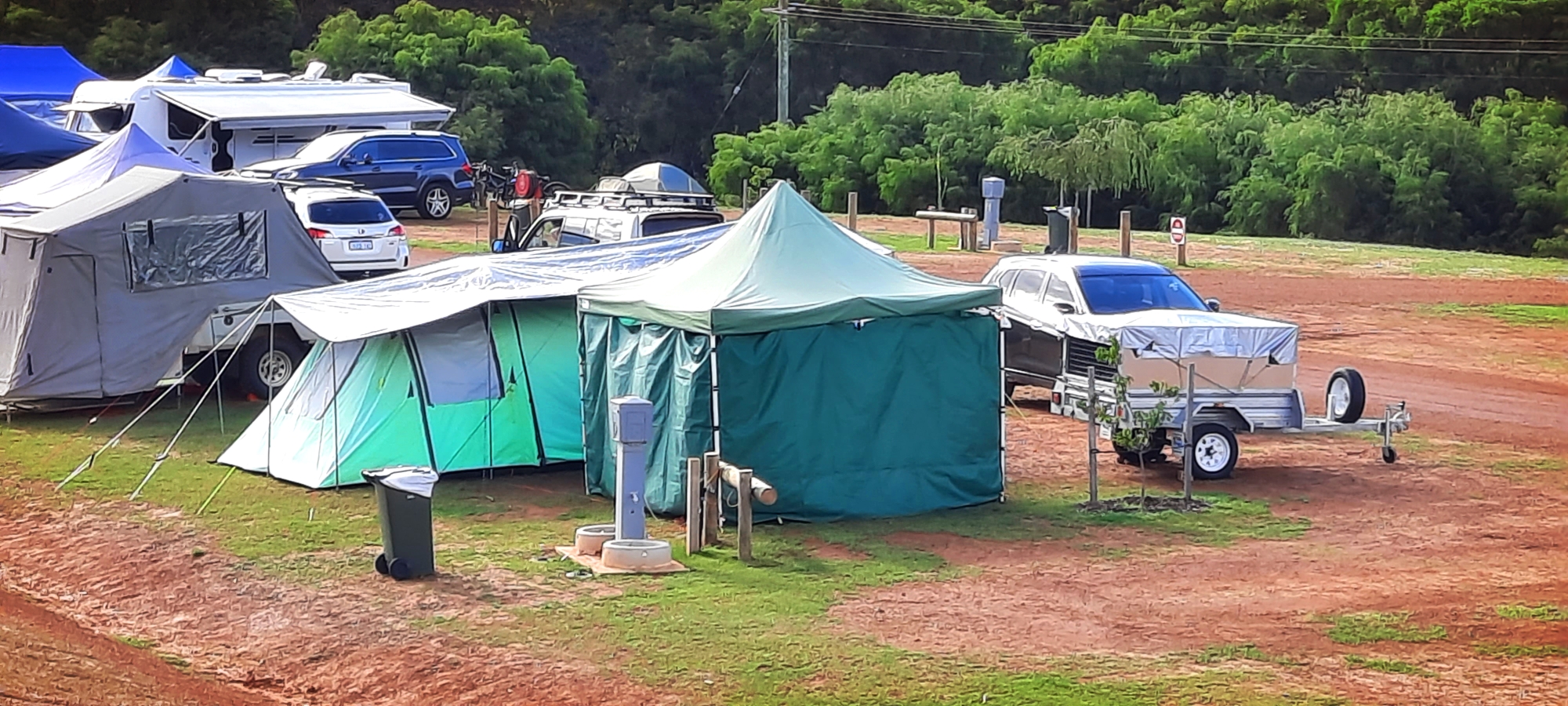 저기 우리집 녹색 텐트 가제보 보인다. 우리사이트 옆에 4사이트가 한꺼번에 아침에 나가서 비어 있다. 잠시 후 2시땡하니 바로 꽉 찼다.