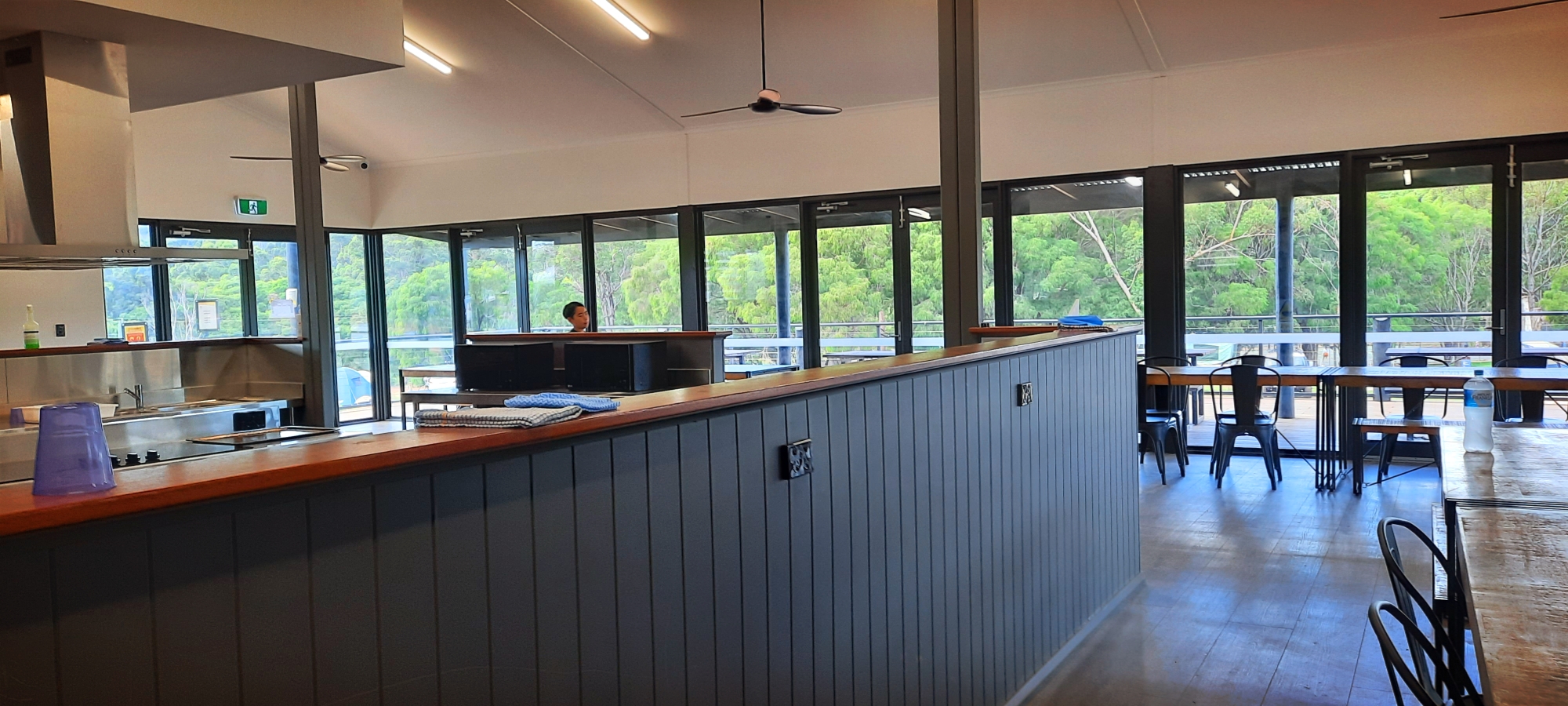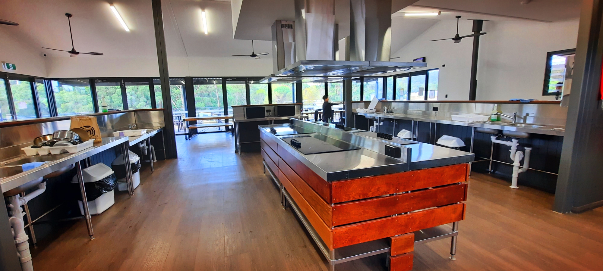 싱크대 4개씩, 그리고 전기cook인지 가스cook인지 중간에 4개씩. 핫워터가 싱크대 옆에 있어서 컵라면 바로 먹기 좋다. 맨끝에는 대형 TV도 있어서 저녘엔 꼬마 아이들 모여서 만화보고 있다.