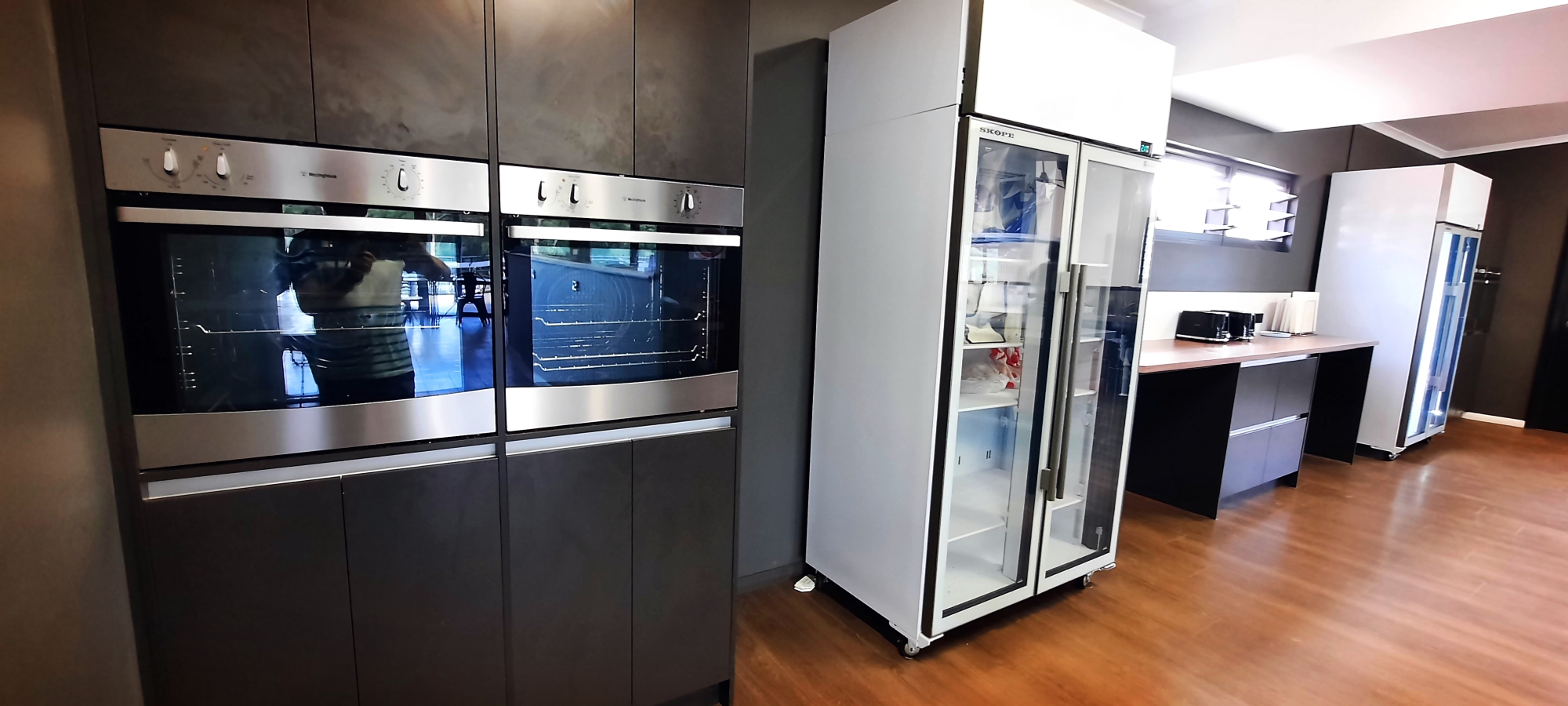오븐도 양쪽에 2개씩, 업소용 냉장고도 양쪽에 1개씩. 냉동실이 없다. ㅠㅠ 중간에 토스트 굽는것도 있고