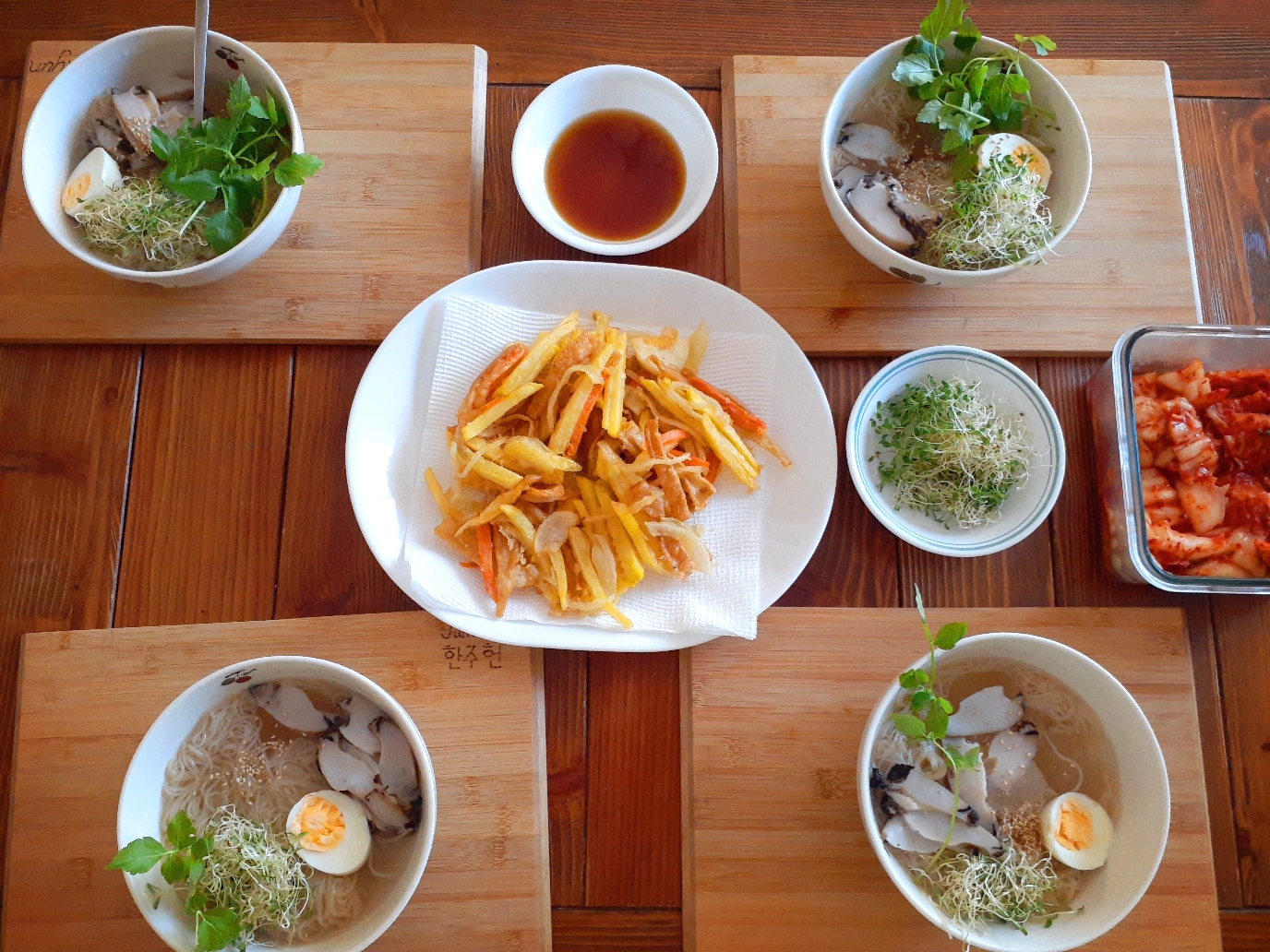 어느날 점심 미나리.전복.새싹 냉면과 야채튀김.