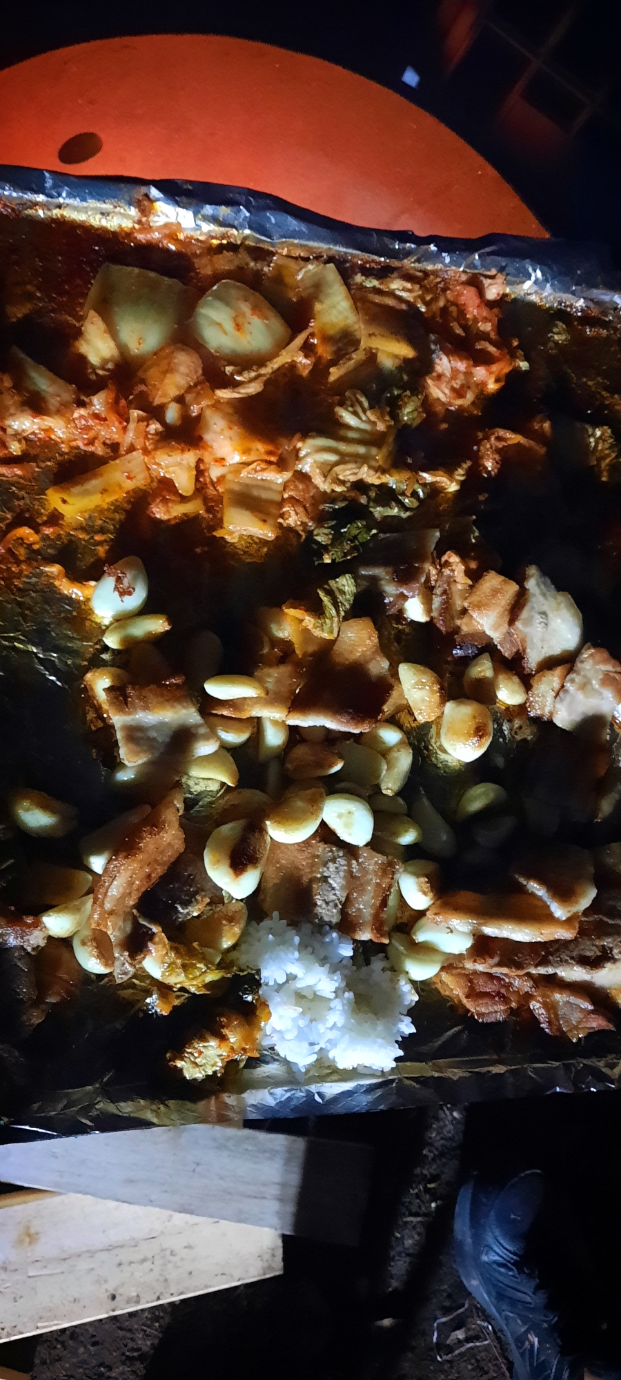 남은 김치랑 마늘 삼겹살 기름에 다 넣어버려.