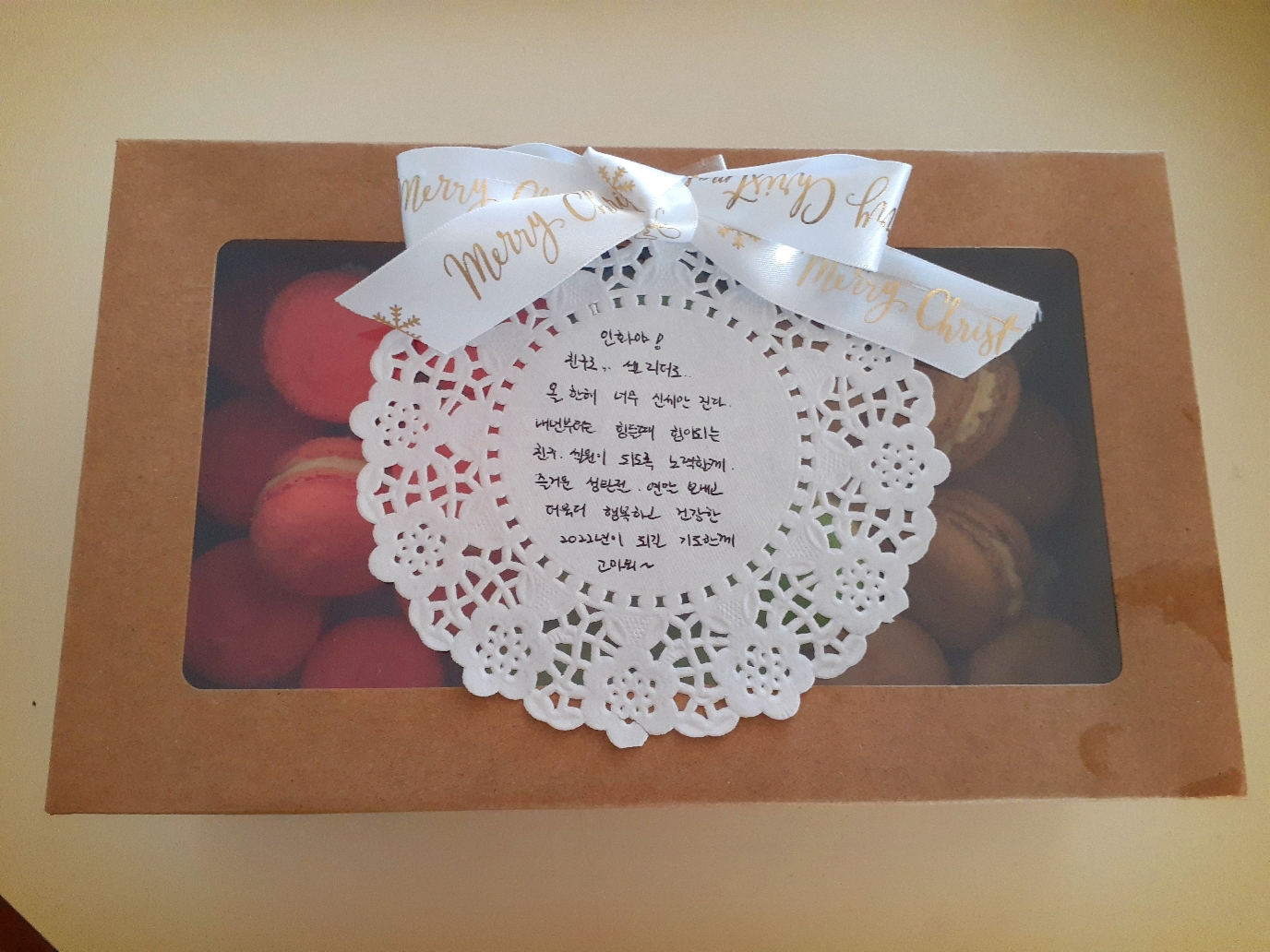 친구에게 선물받은 수제 마카롱과 성탄 선물.