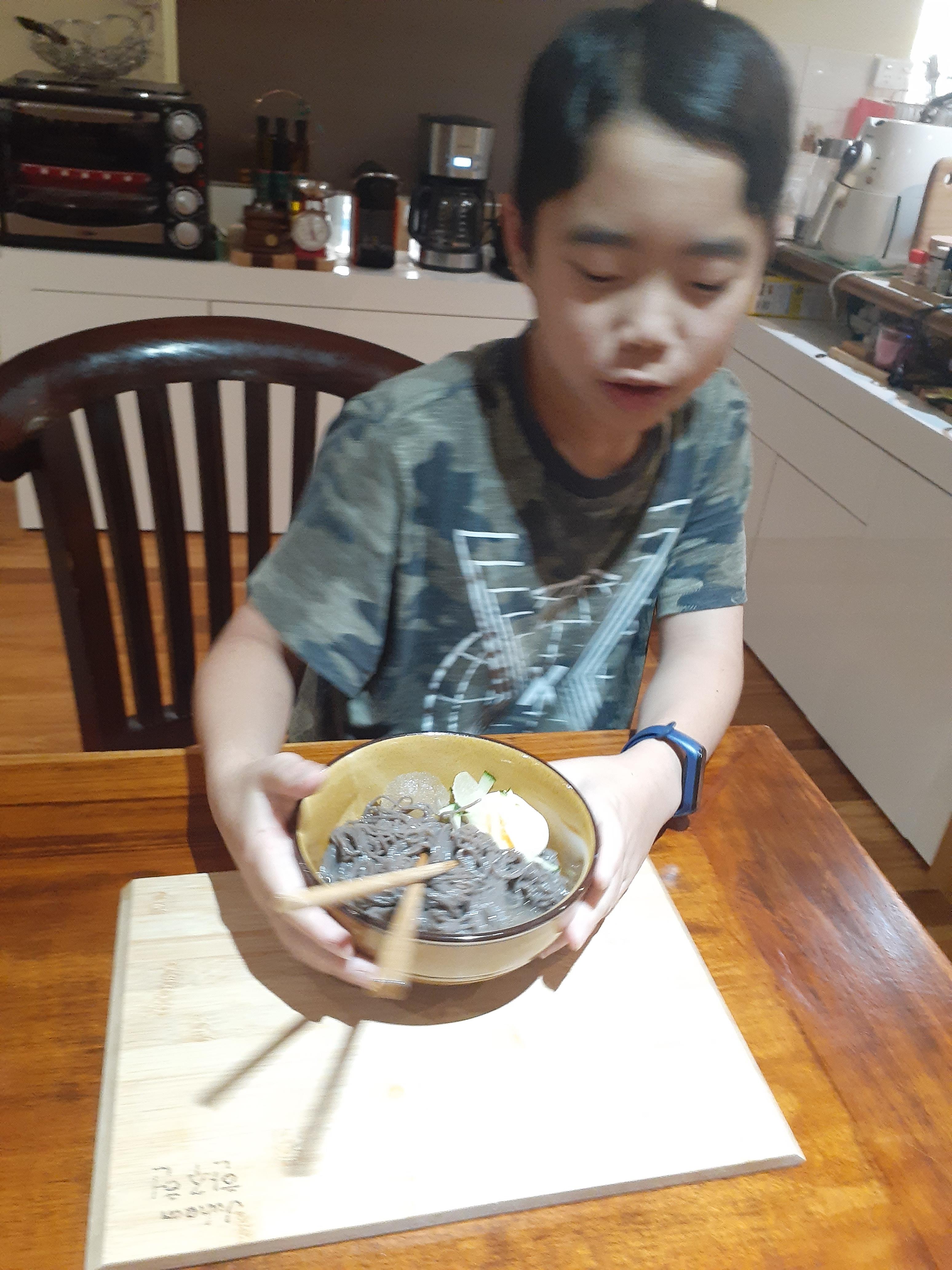 오늘은 손수 갈아주신 진한 콩국에 얼음 듬뿍 갈아올려서 엄마아빠만 콩국수. 얼움이 과했네~ 콩국이 안보여~