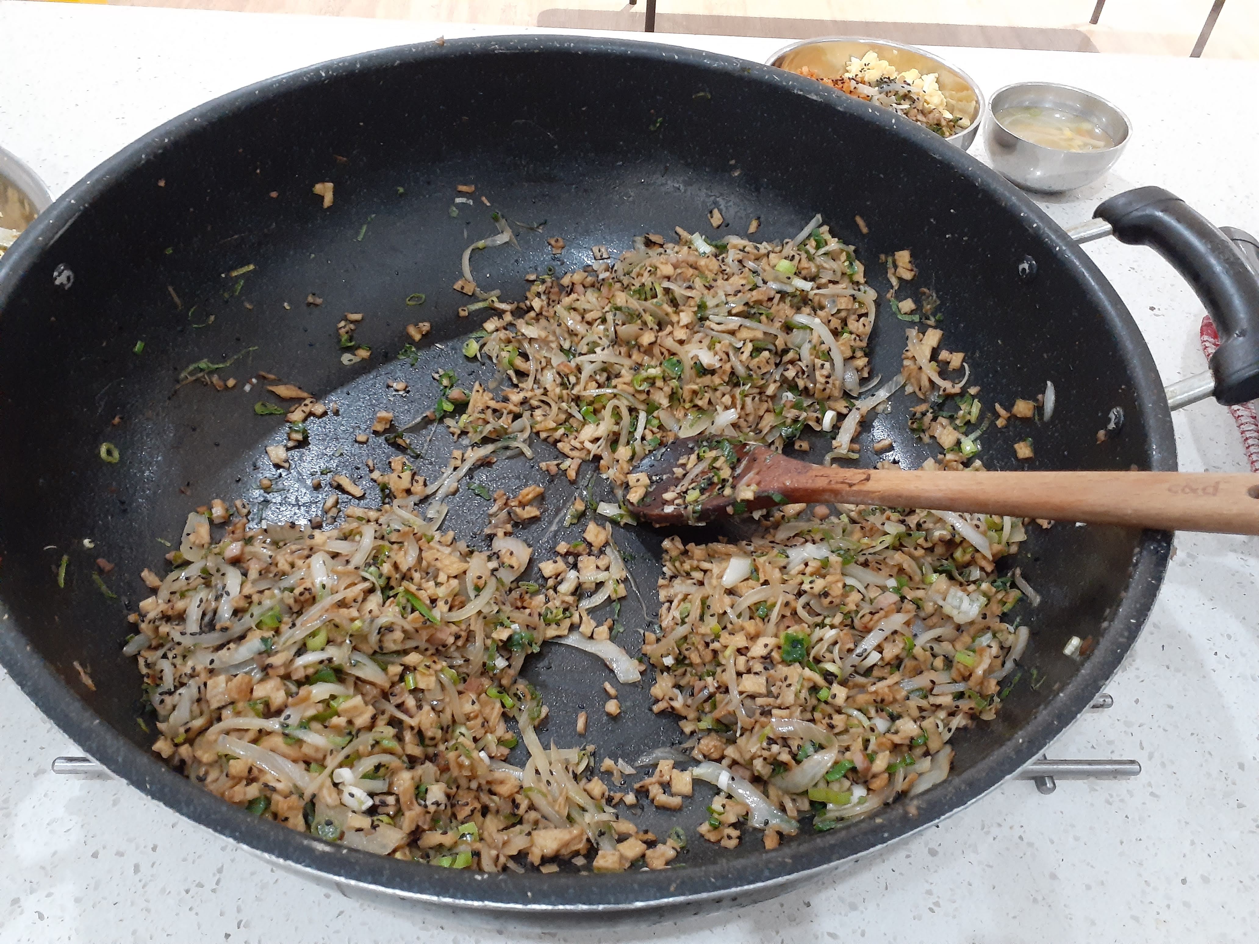 애들 좋아하는 스팸,김치볶음,어묵볶음,스크램블 에그 덮밥과 콩나물국