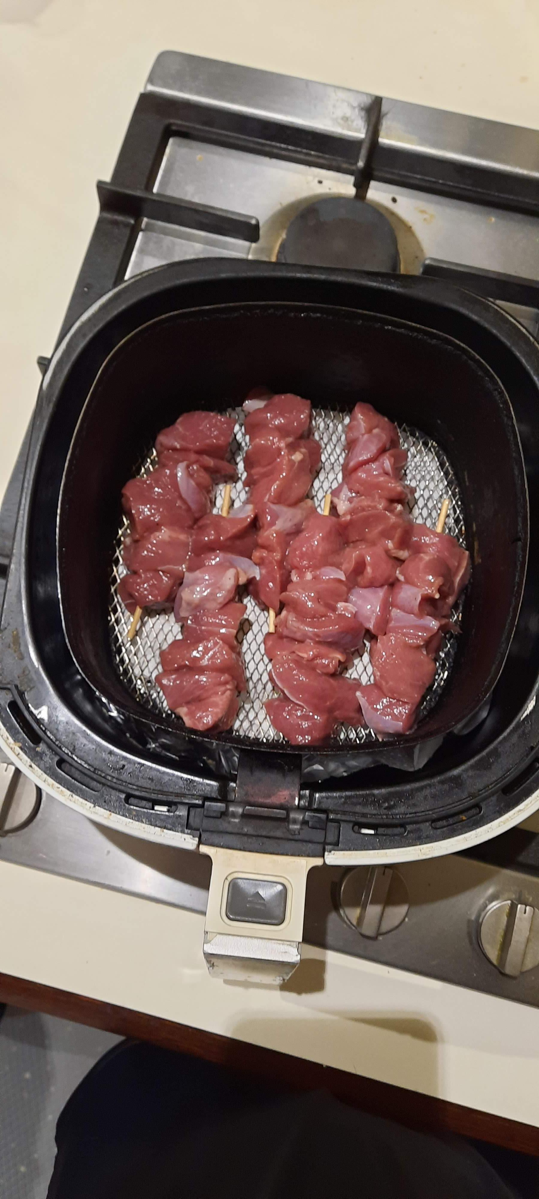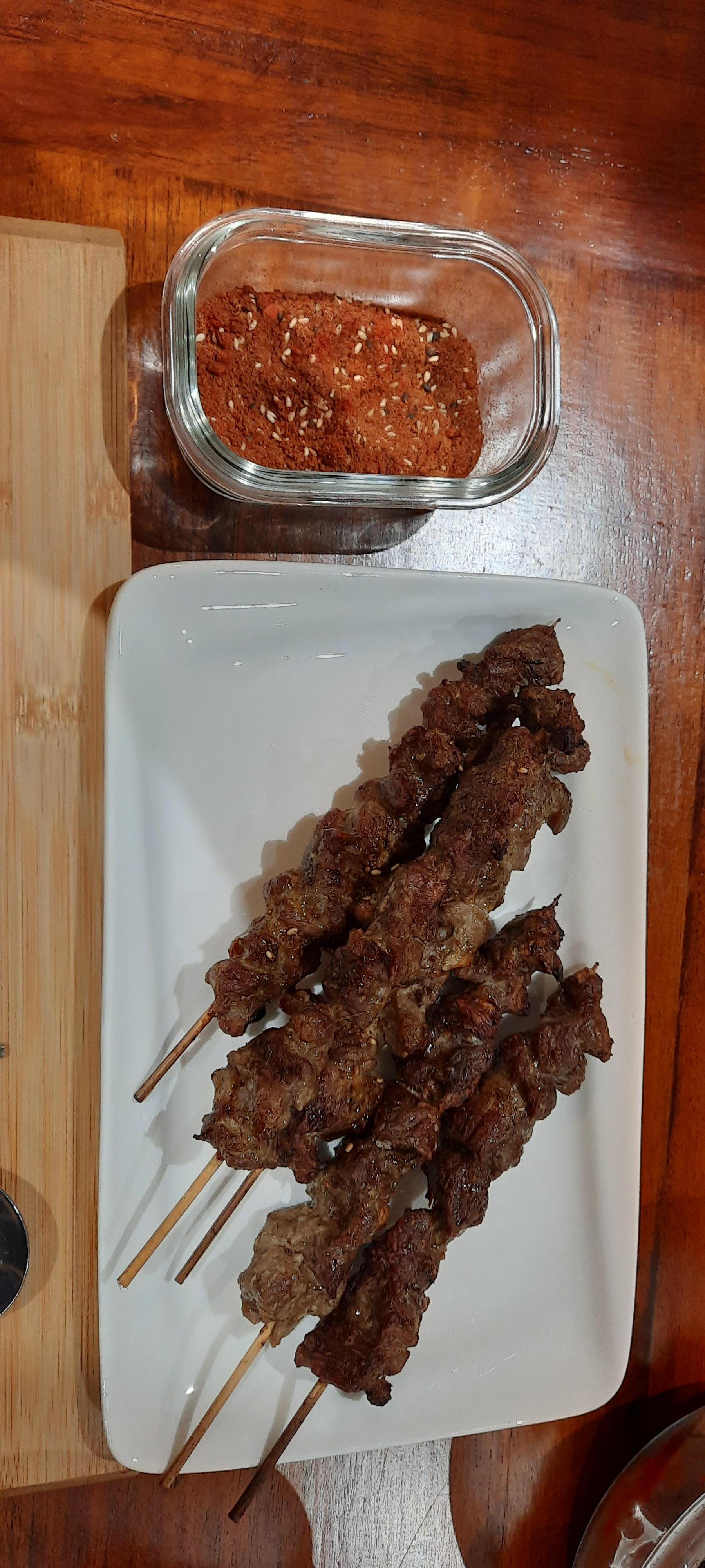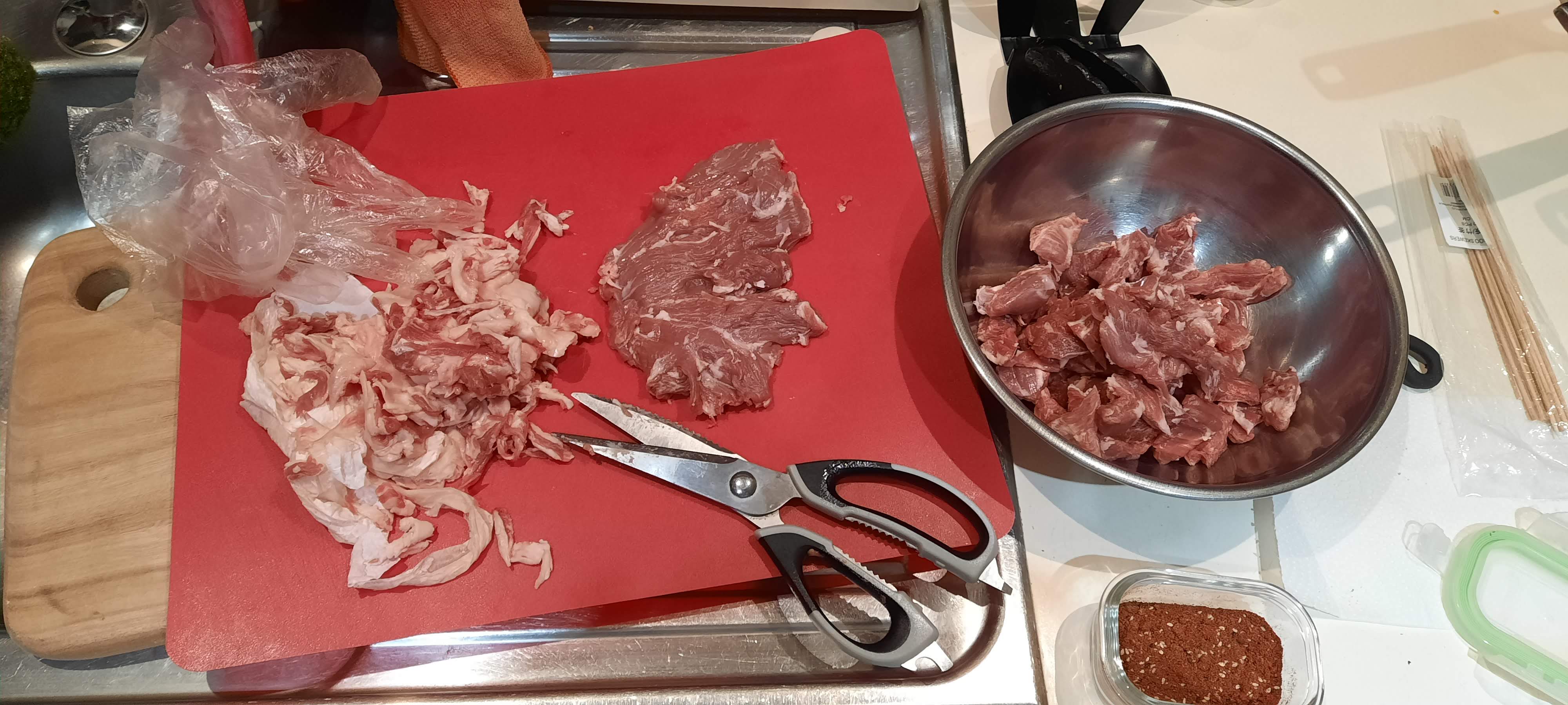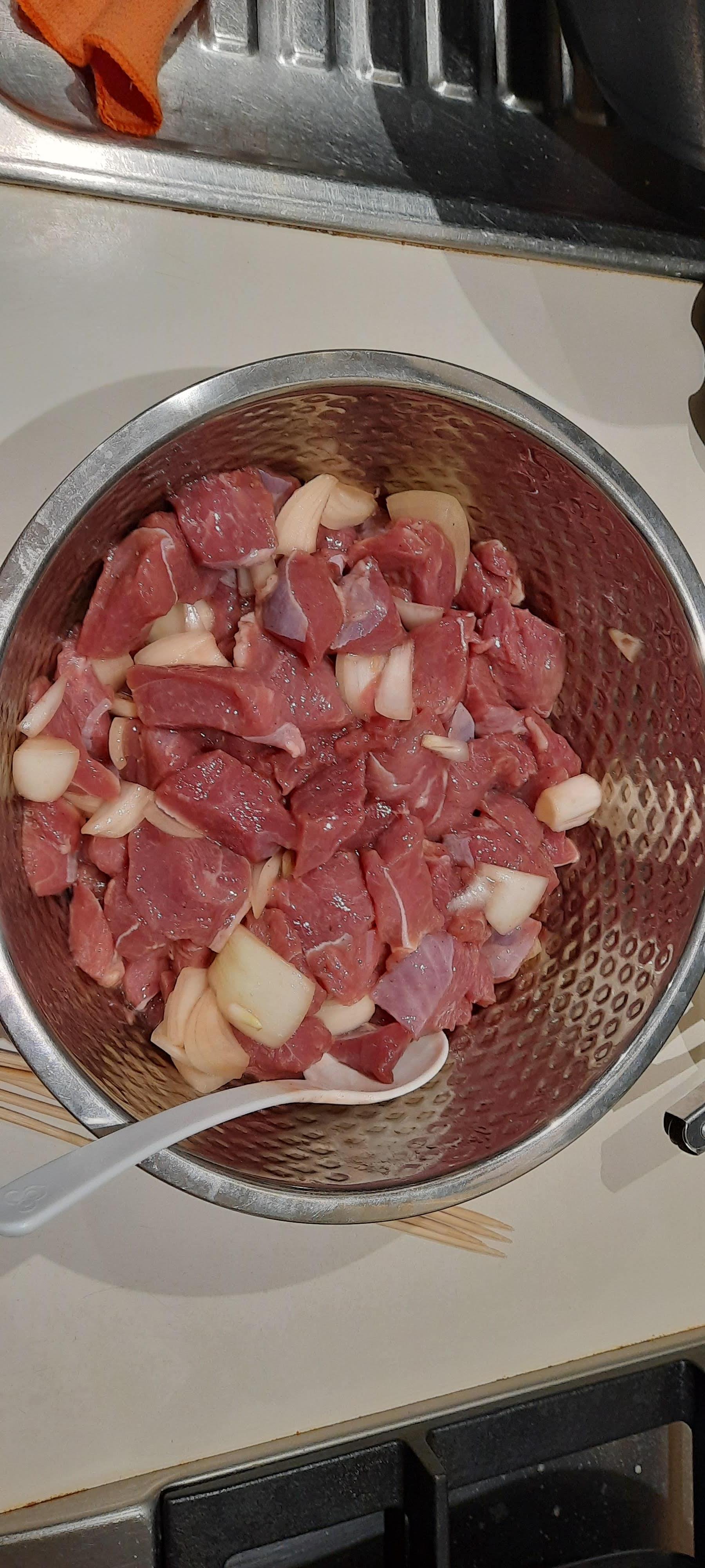 양꼬치 꽂기 전 양념에 절여두기.