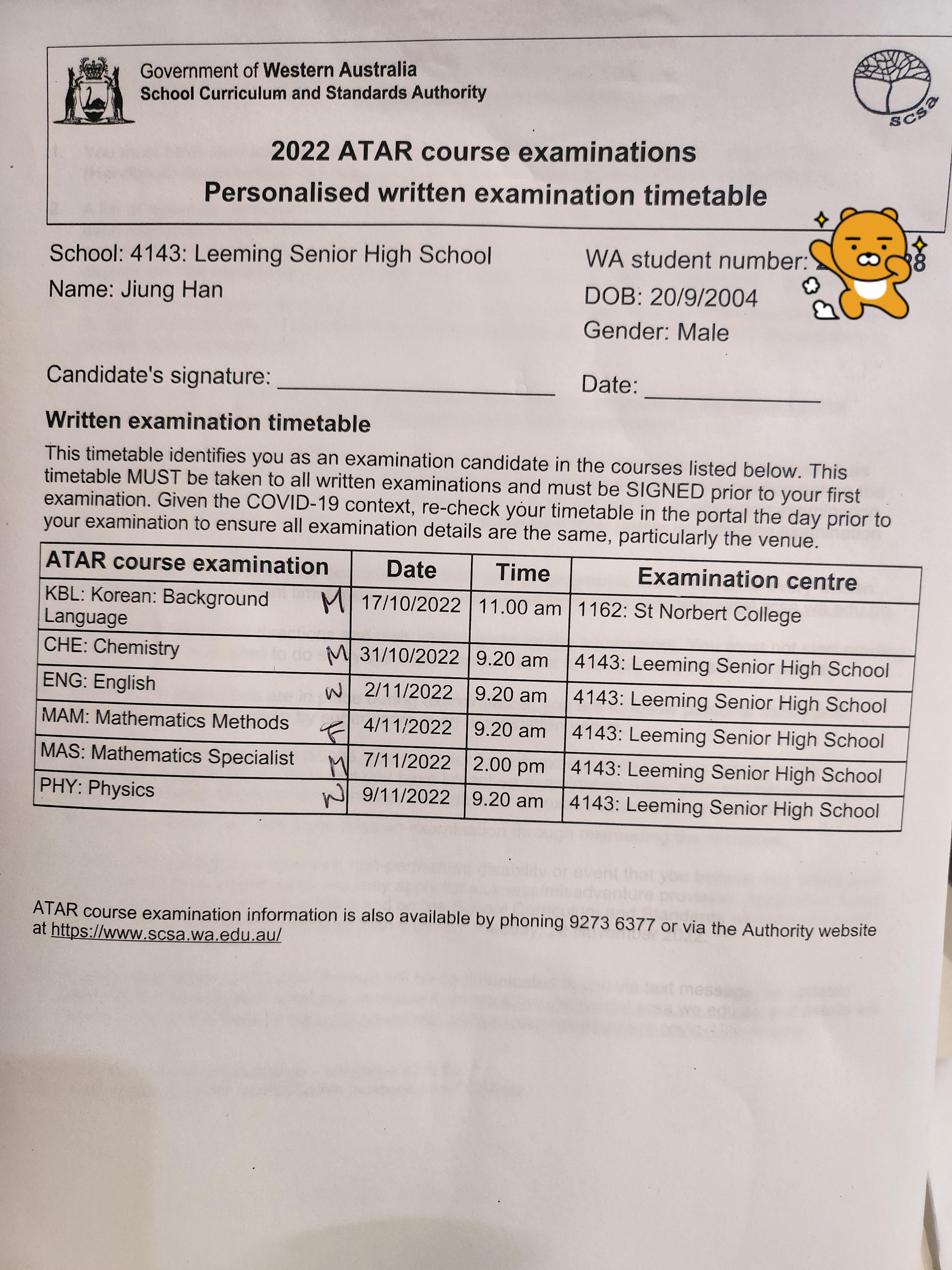 지웅이 대학시험 시간표.