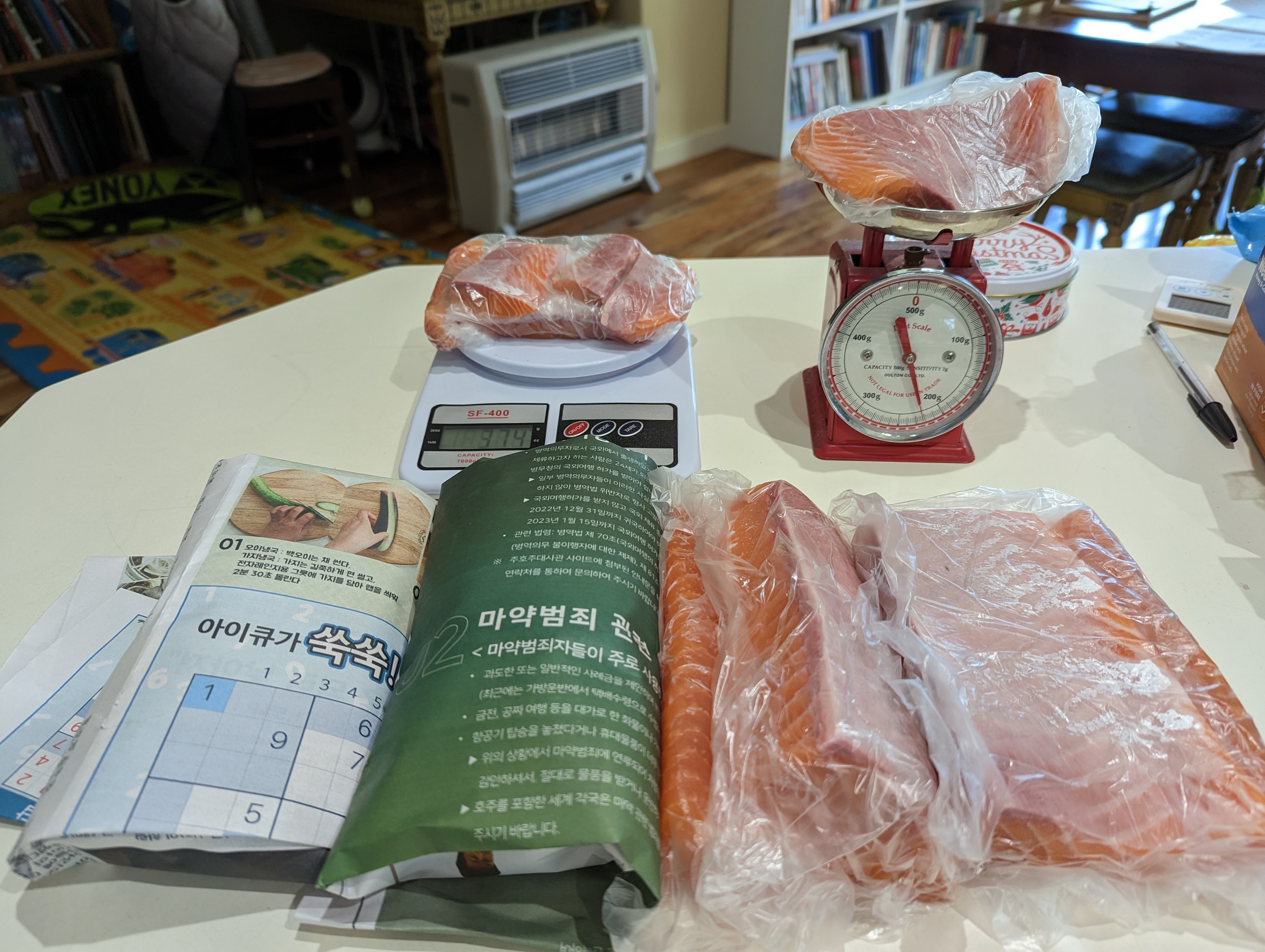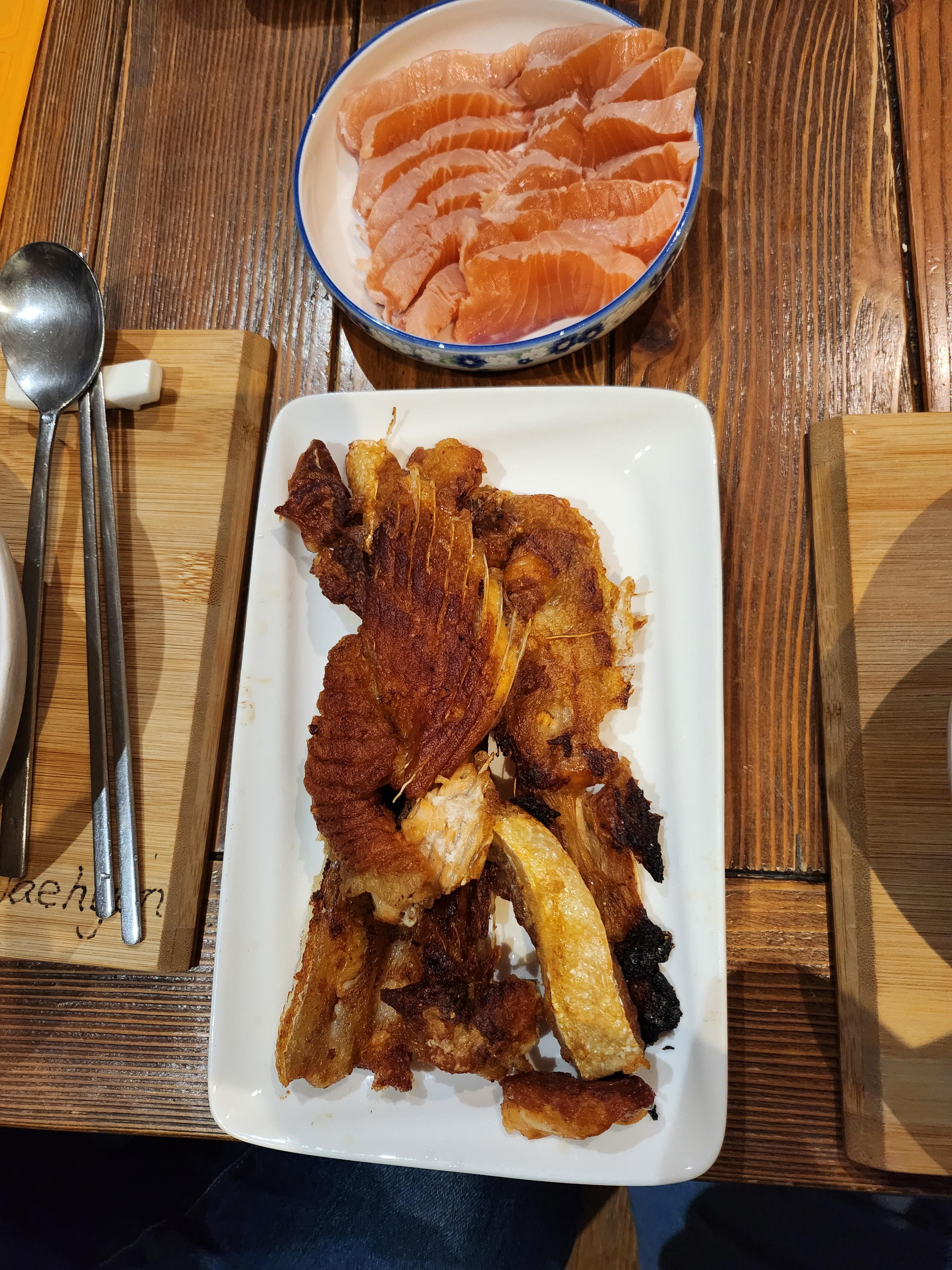 크리스 마스 파티를 위해 연어 한마리 잡았다. 일단 연어회 빼고 가시부위 살 구워먹기. 연어는 개별 포장해서 냉동실로.