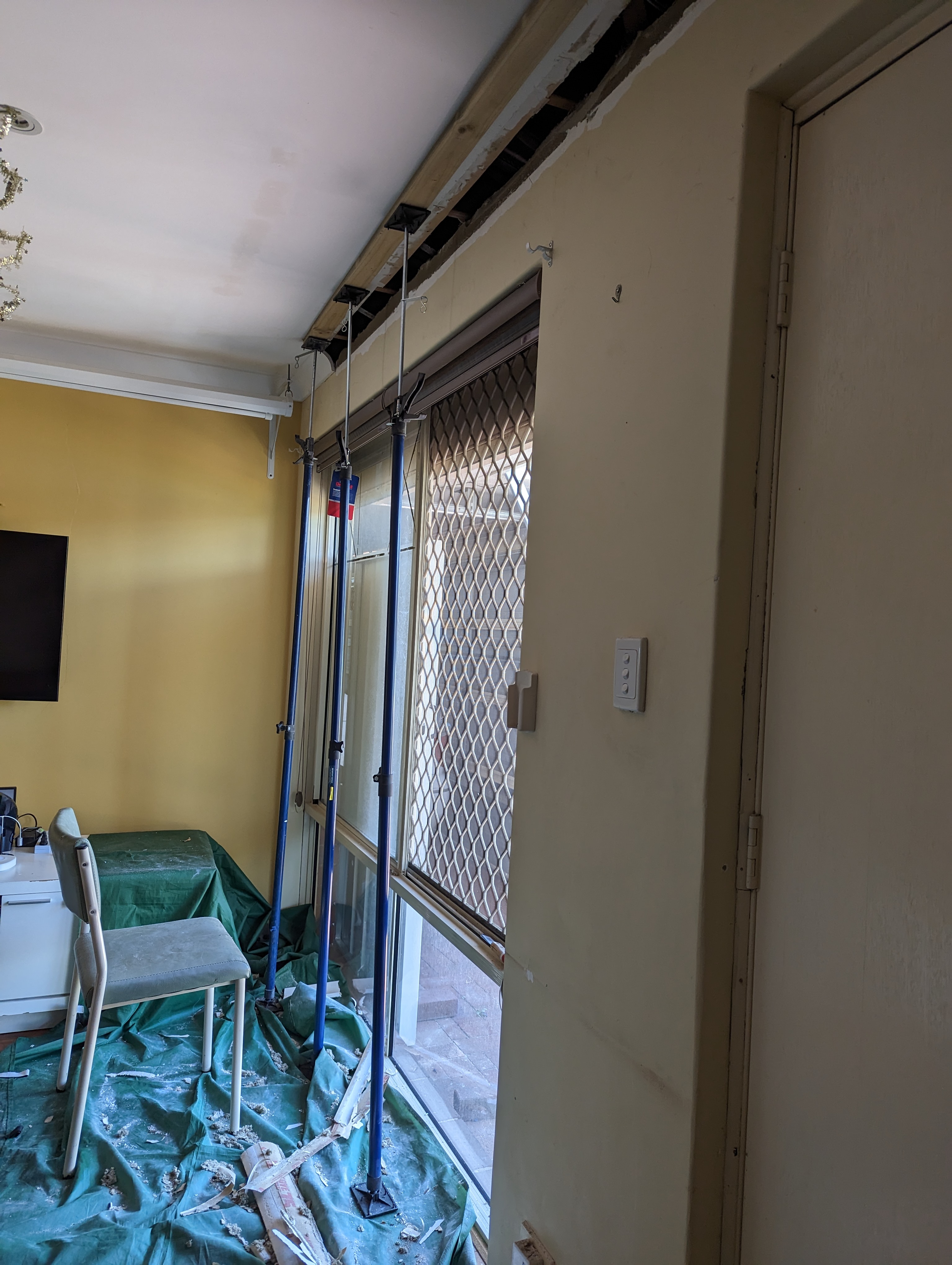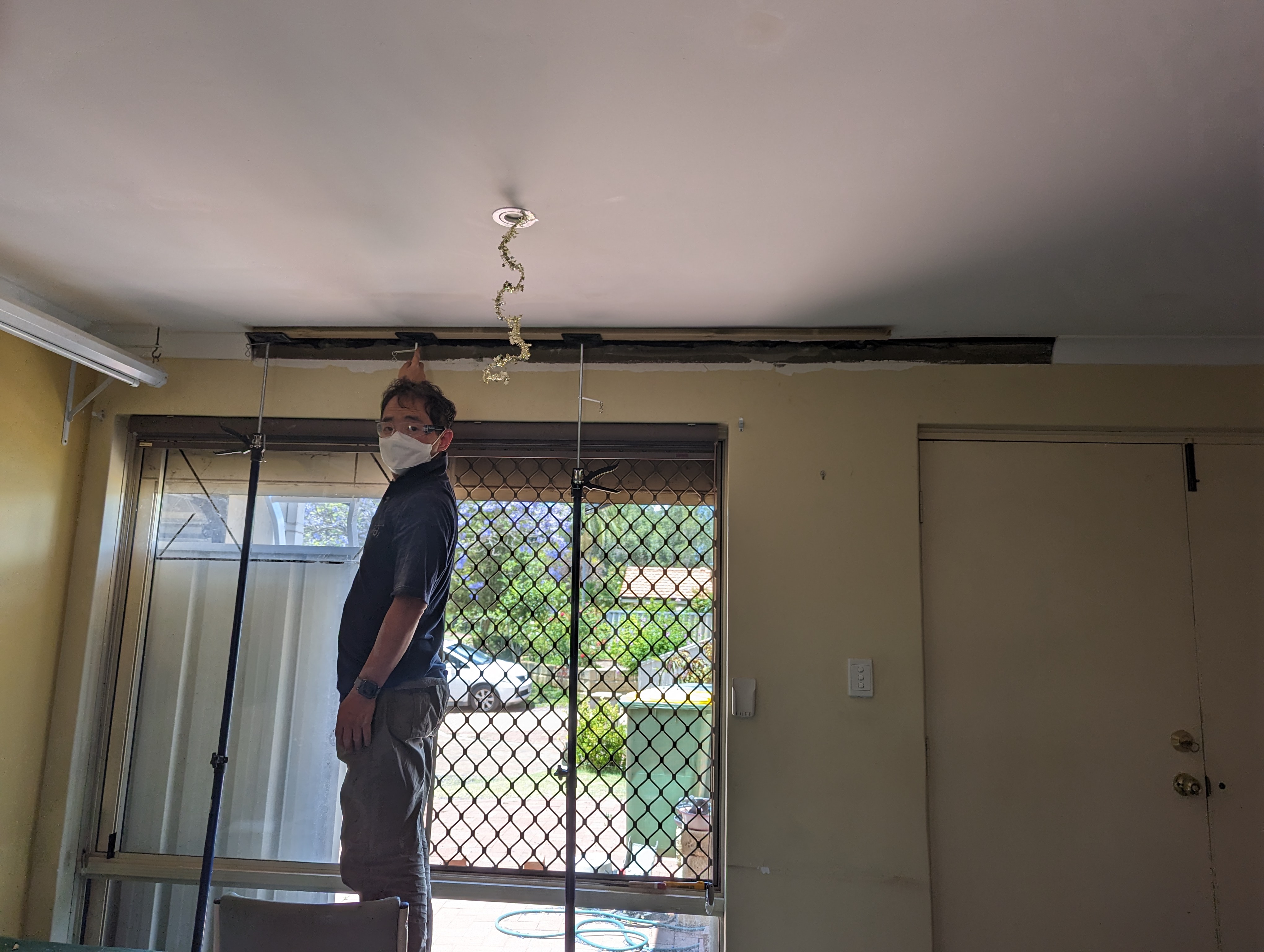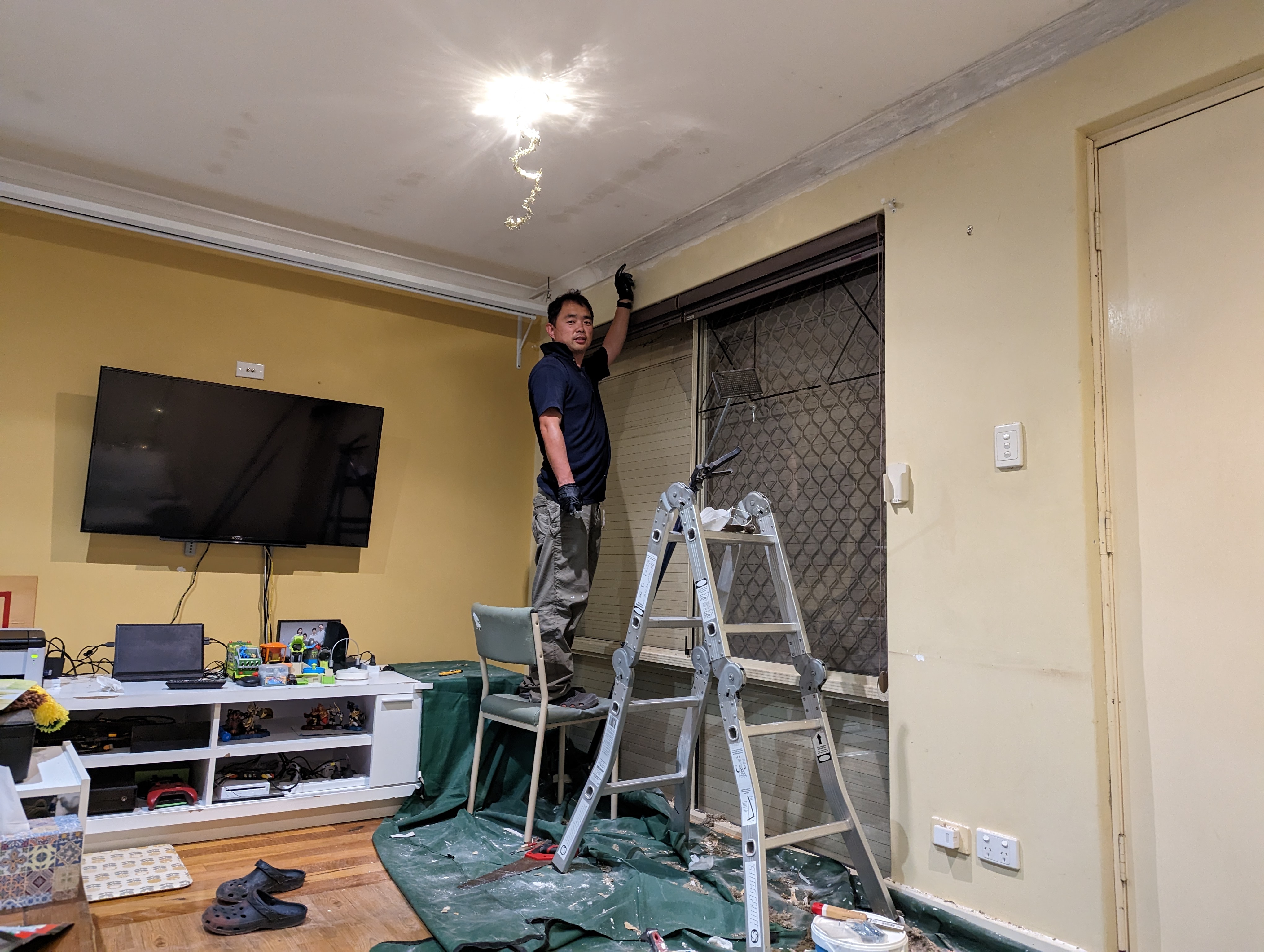 아빠는 천장 몰딩 수리중