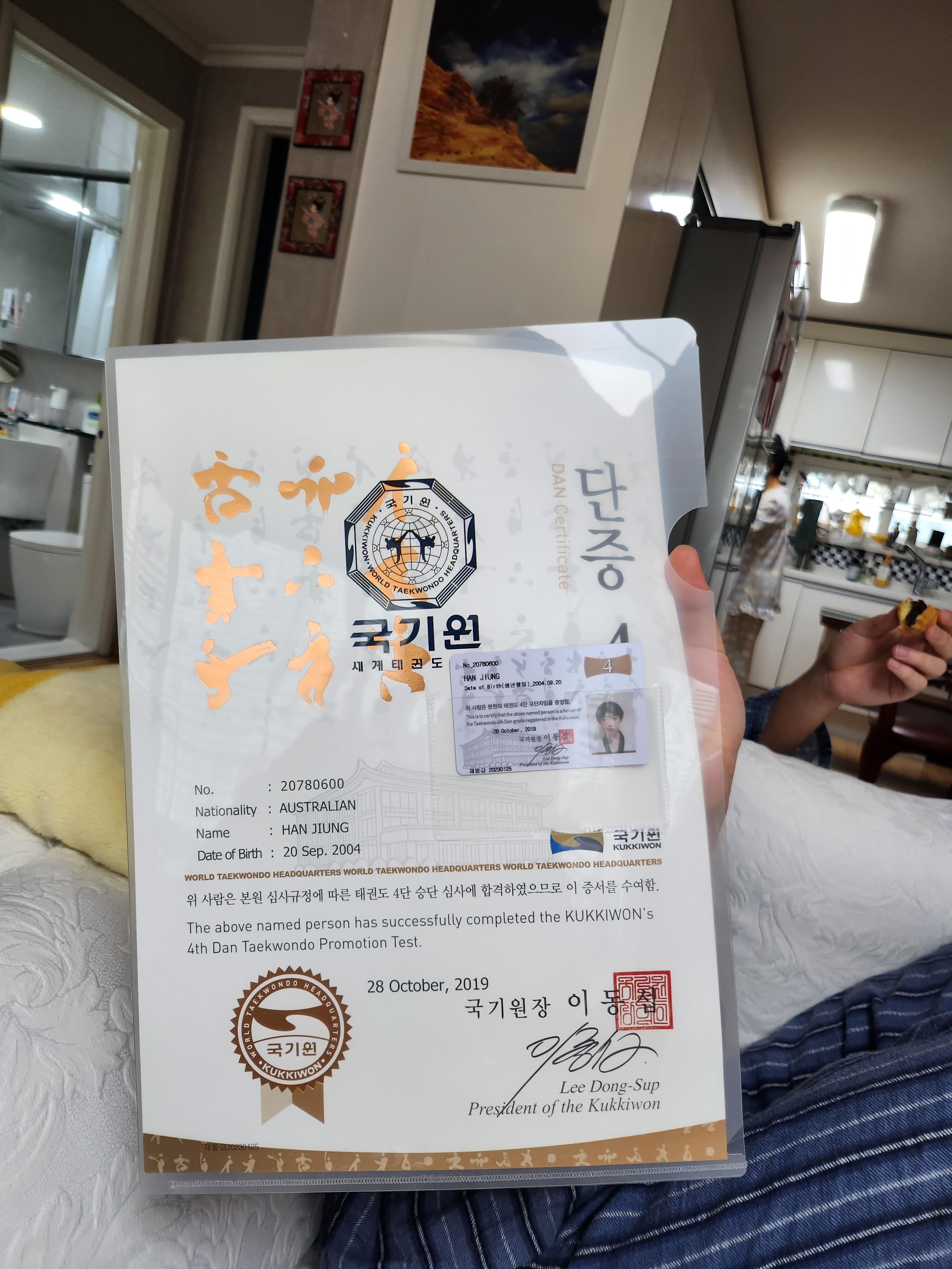 지웅이 국기원에 4품에서 4단 신청해서 단증 받음.