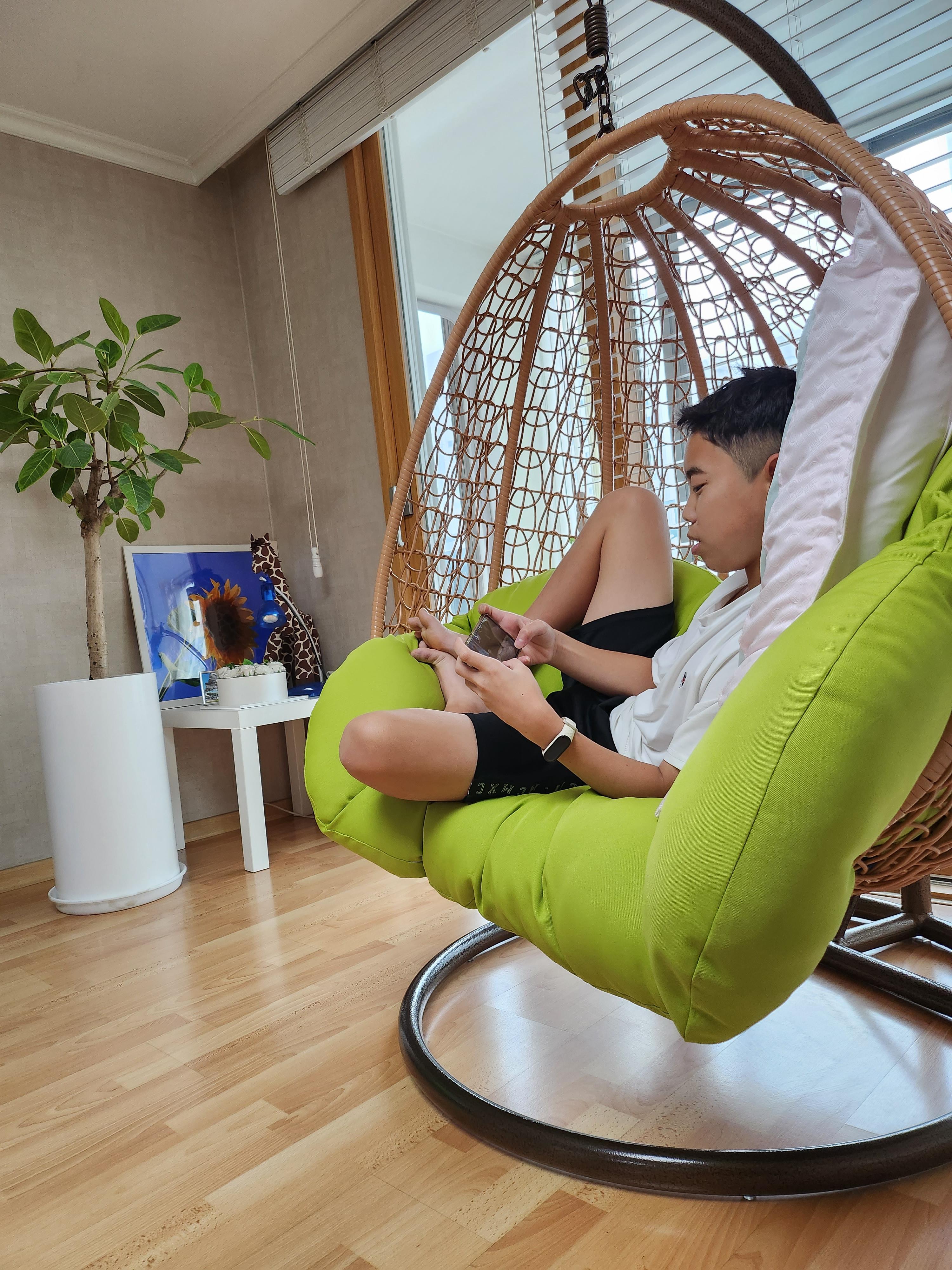 풍암동 할머니집 입성. 그리워하던 새장 의자에 자리잡고 게임 하는군.