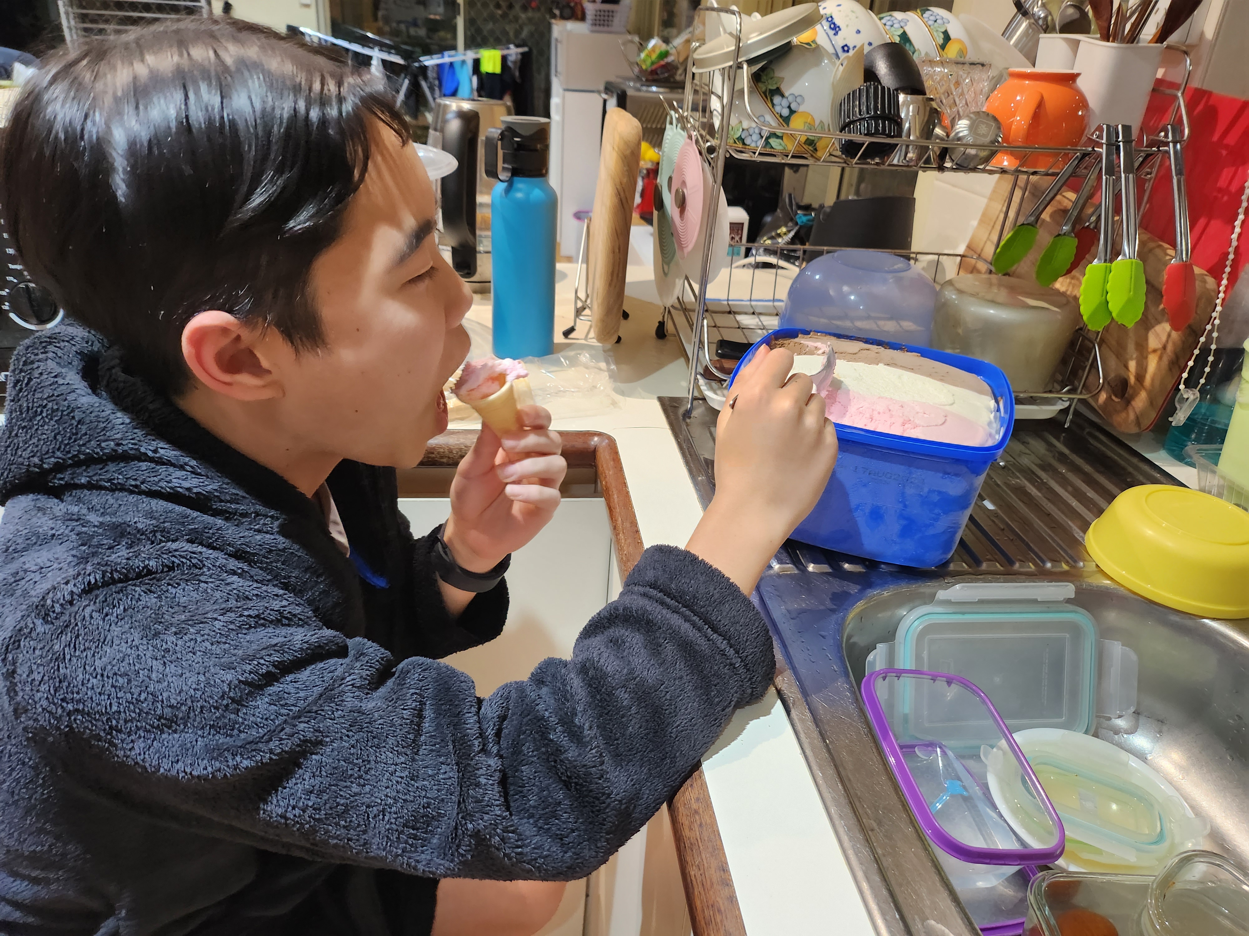흘리지 말라고 했더니 싱크대 앞에서 아이스크림 콘 먹는 주헌.