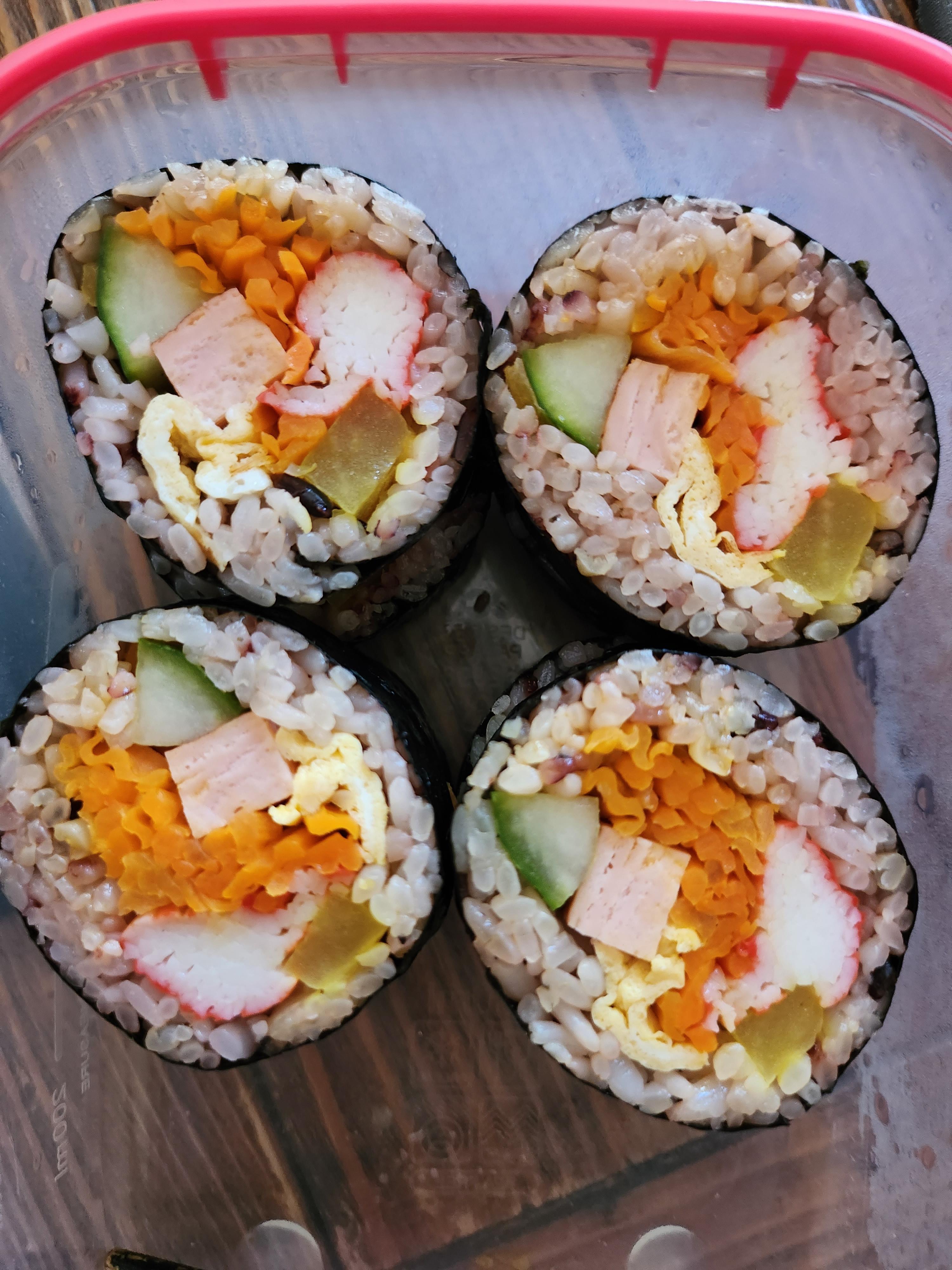 아침에 부지런히 만든 김밥. 밥알이 살아있네~