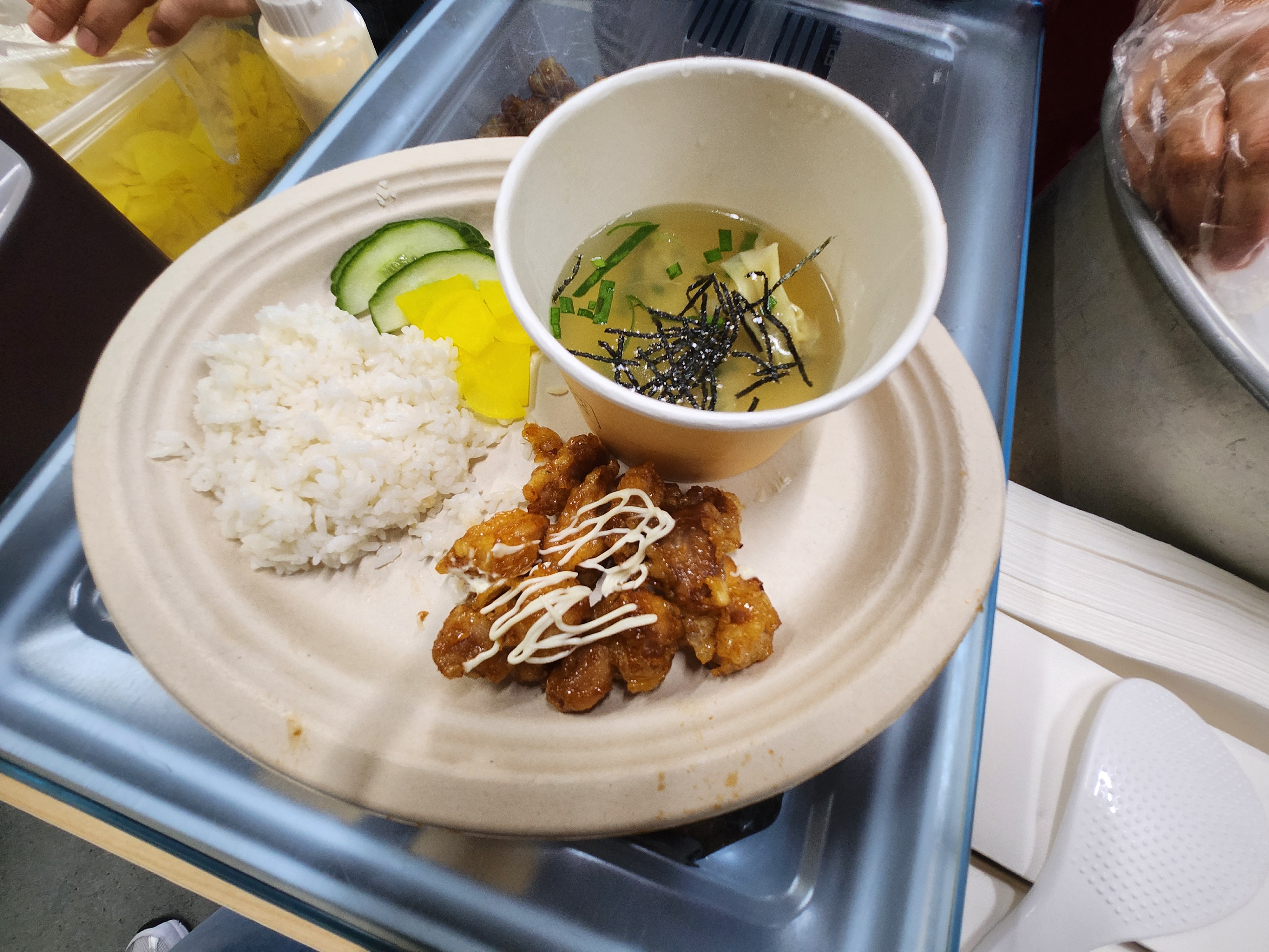 저녁 밥, 데리야끼 양념치킨, 오이, 단무지, 완탕