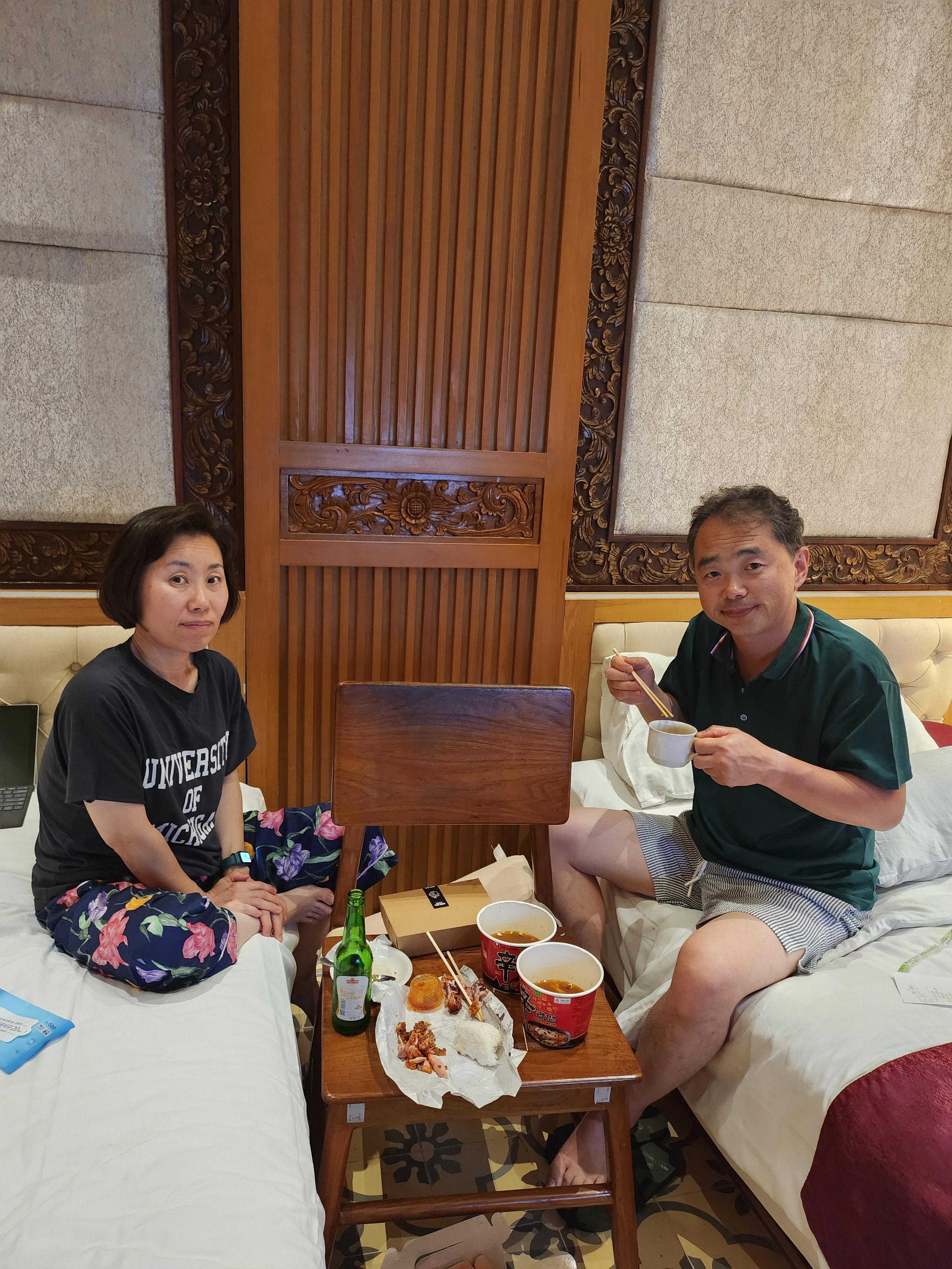 저녁은 S로 시작하는 한국 치킨(그랩으로 배달)과 치킨 호텔 라운지에서 픽업할때 근처 편의점가서 사온 컵라면