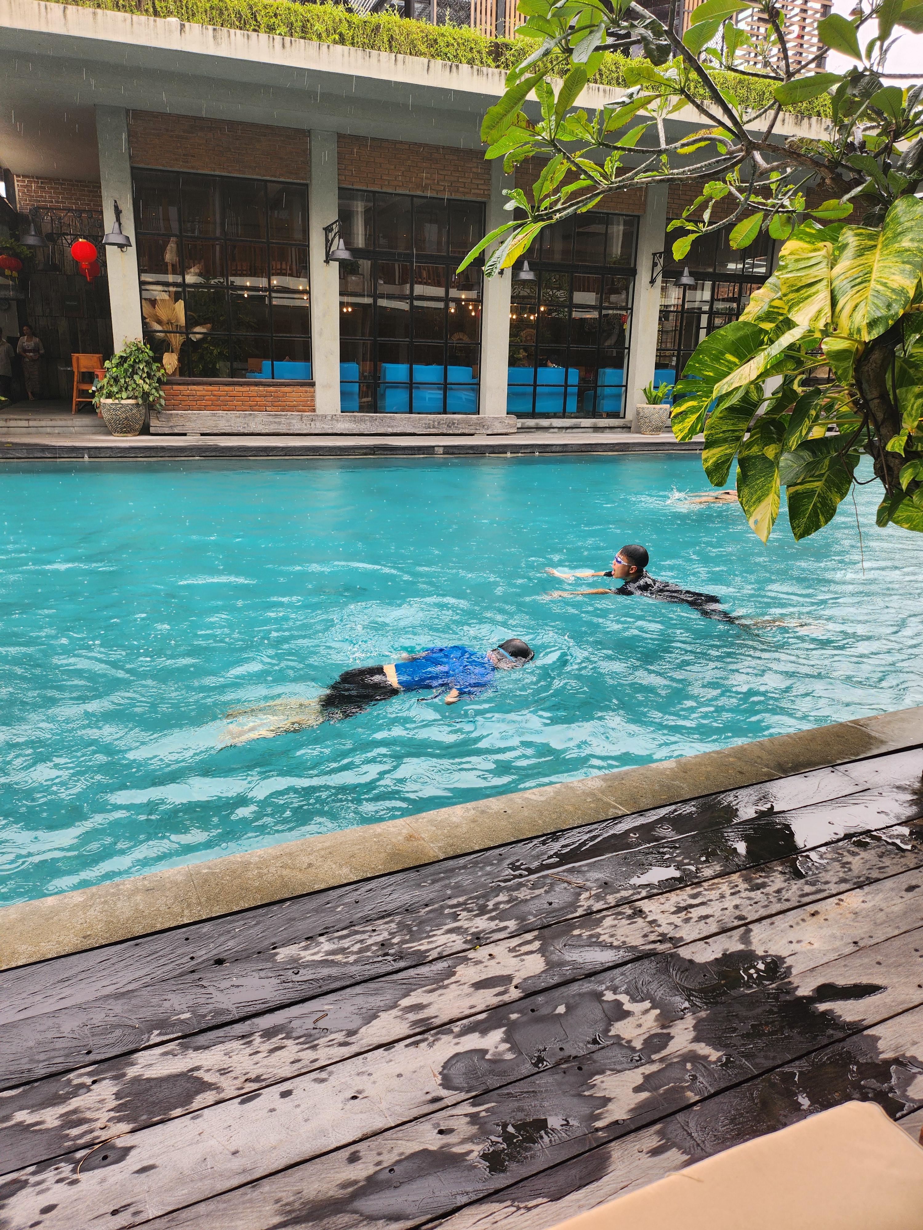 컨디션 좋은 재현아빠랑 주헌이는 아침먹고 우중 수영.