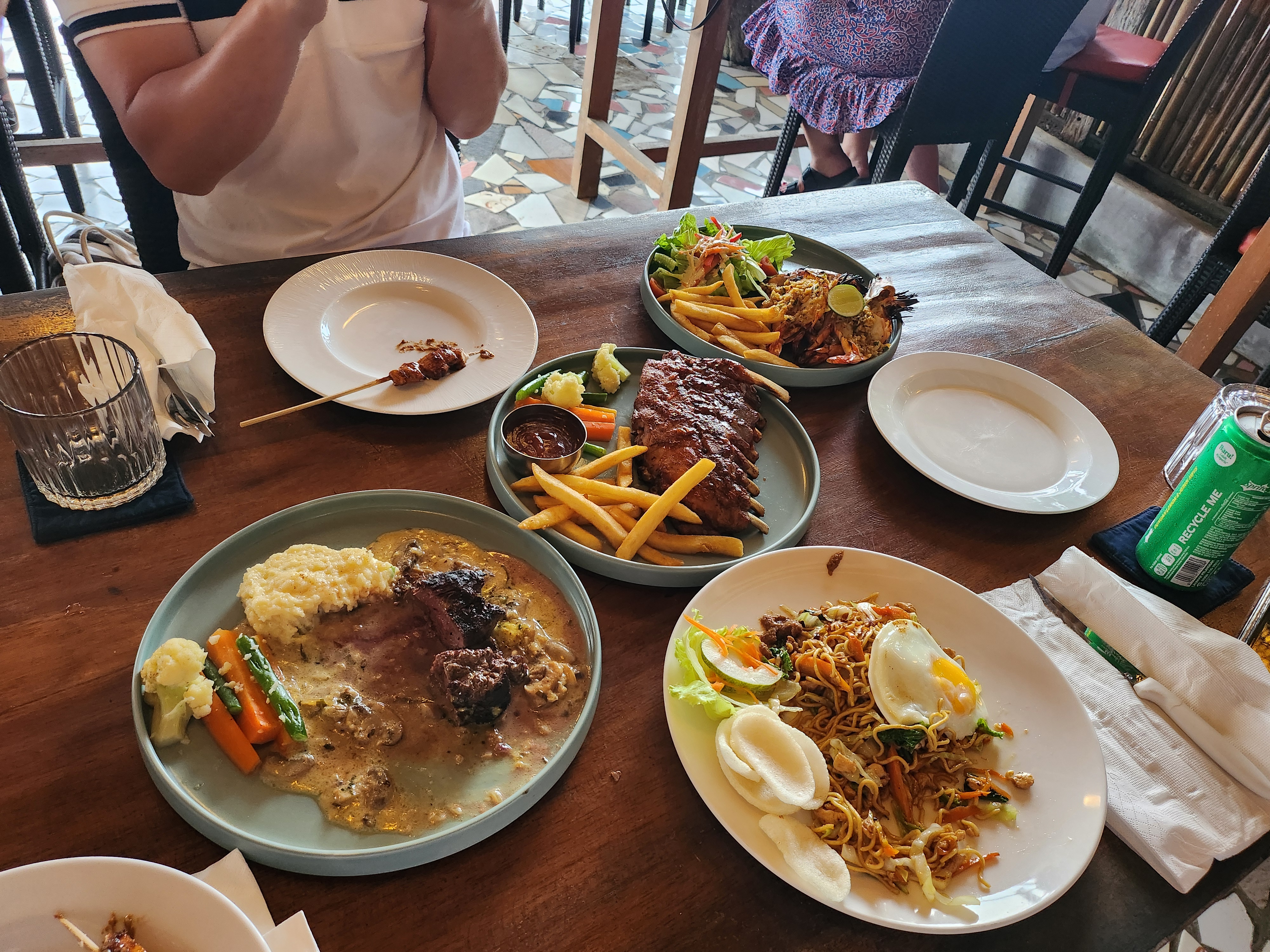 우리는 스테이크, 누들, 폭립, 왕새우 구이 싹싹 긁어먹음