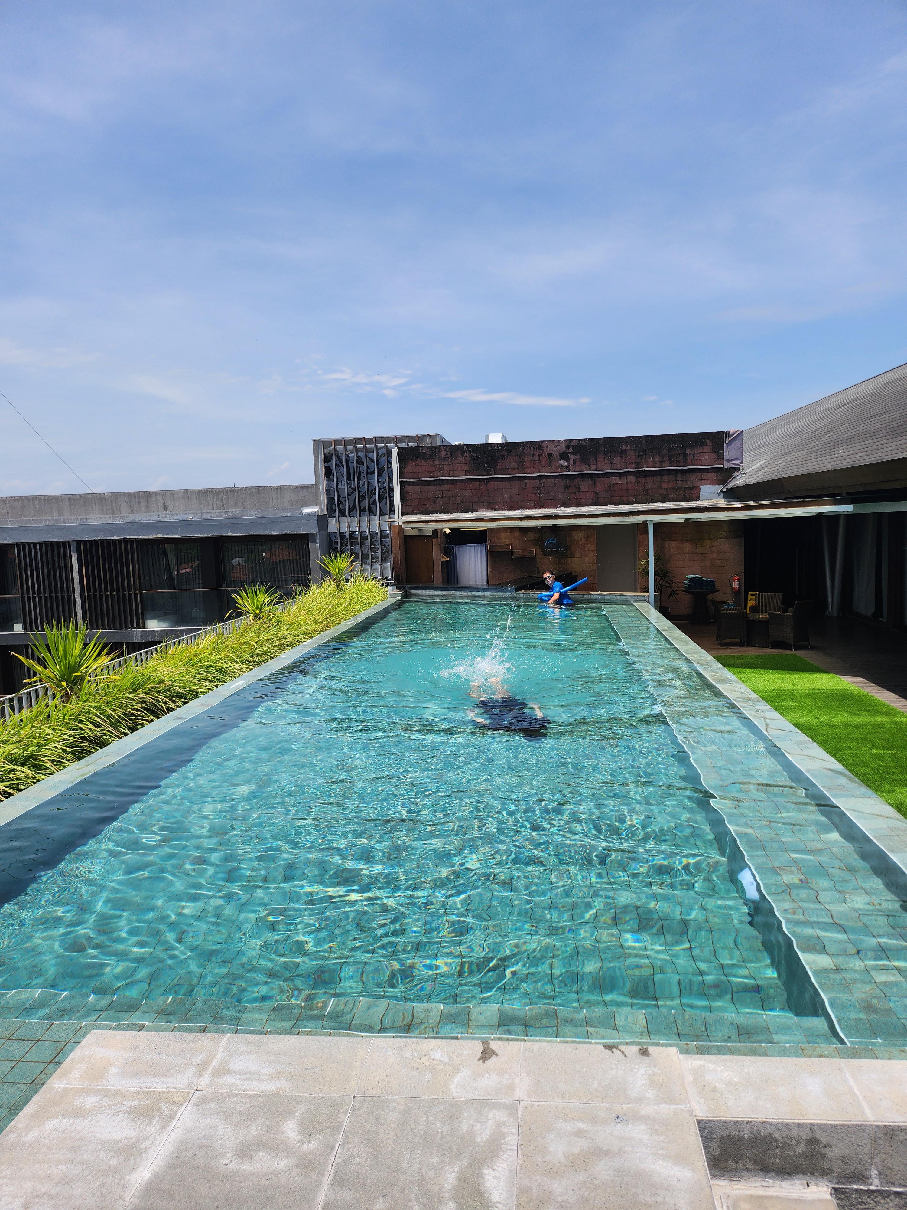 숙소 베란다에서 바라본 1층 수영장. 한가함